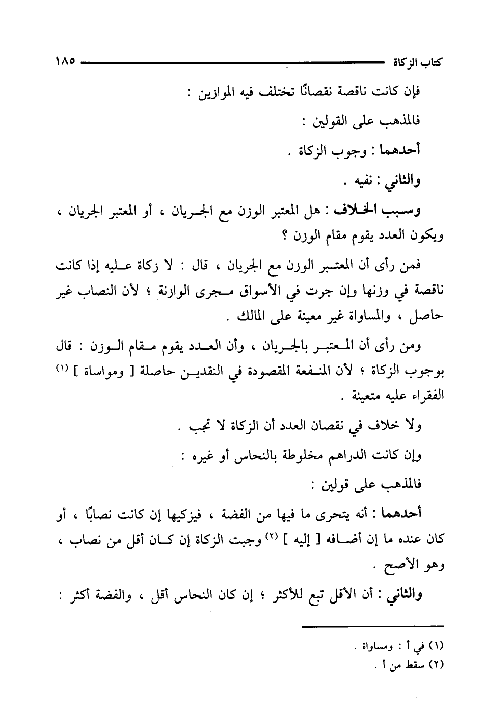 فمن رأى أن المعتبر الوزن مع الجريان، قال: لا زكاة عليه إذا كانت ناقصة في وزنها وإن جرت في الأسواق مجرى الوازنة؛ لأن النصاب غير حاصل، والمساواة غير معينة على المالك.