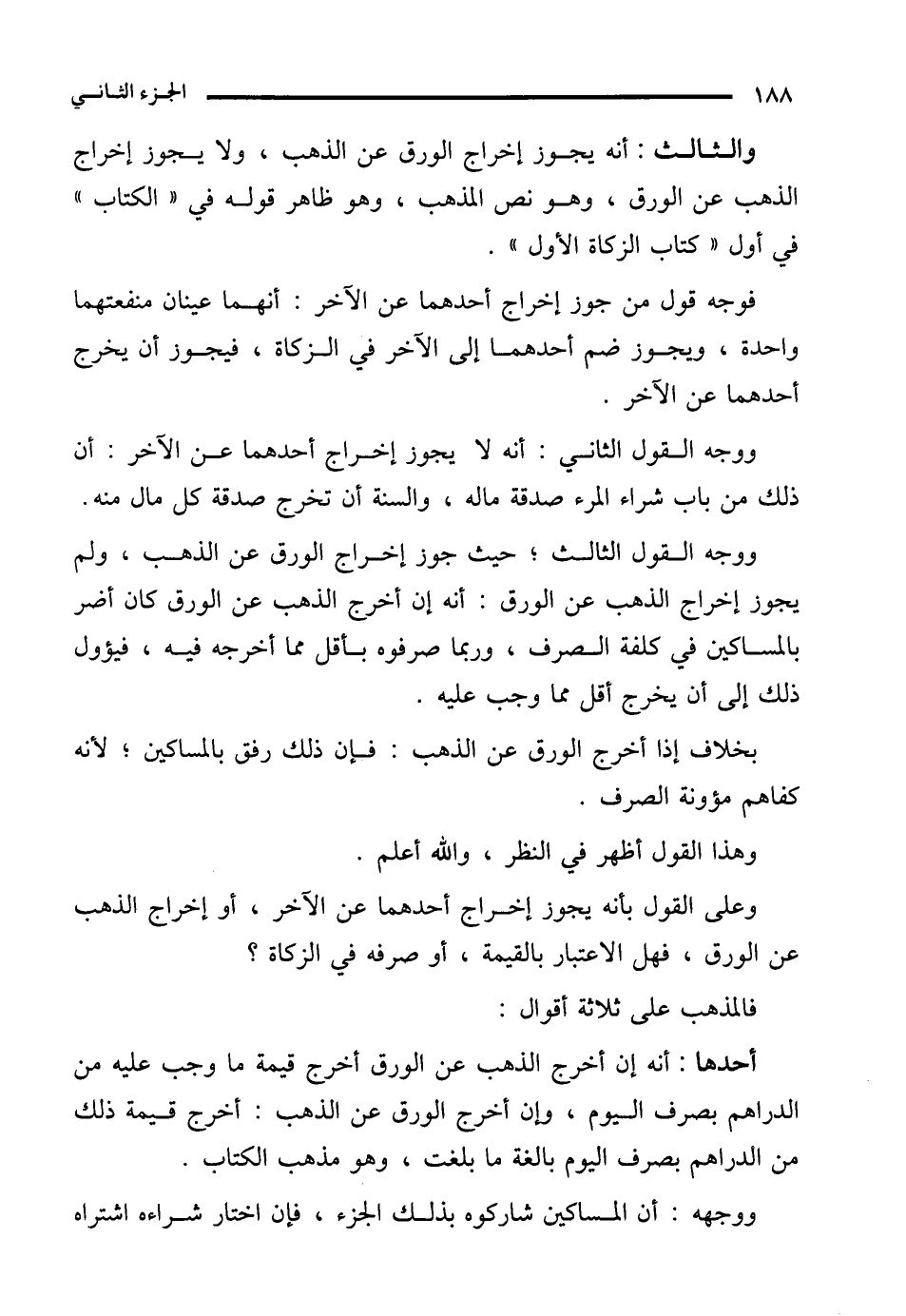 ووجه القول الثالث؛ حيث جوز إخراج الورق عن الذهب، ولم يجوز إخراج الذهب عن الورق: أنه إن أخرج الذهب عن الورق كان أضر بالمساكين في كلفة الصرف، وربما صرفوه بأقل مما أخرجه فيه، فيؤول ذلك إلى أن يخرج أقل مما وجب عليه.