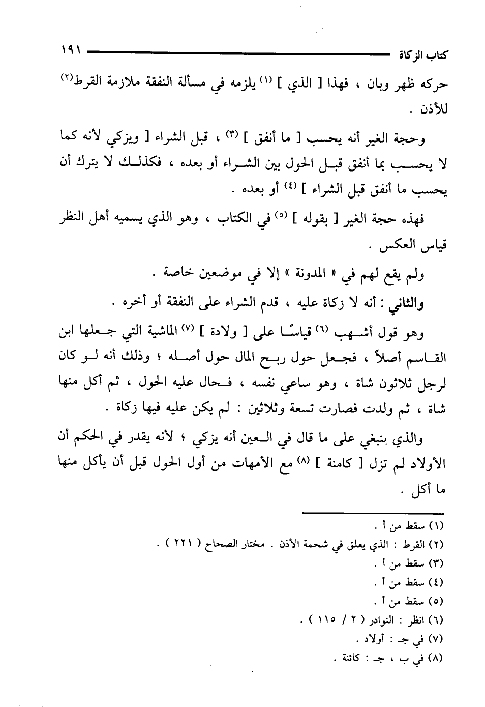 وهو قول أشهب (¬6) قياسًا على [ولادة] (¬7) الماشية التي جعلها ابن القاسم أصلًا، فجعل حول ربح المال حول أصله؛ وذلك أنه لو كان لرجل ثلاثون شاة، وهو ساعي نفسه، فحال عليه الحول، ثم أكل منها شاة، ثم ولدت فصارت تسعة وثلاثين: لم يكن عليه فيها زكاة.