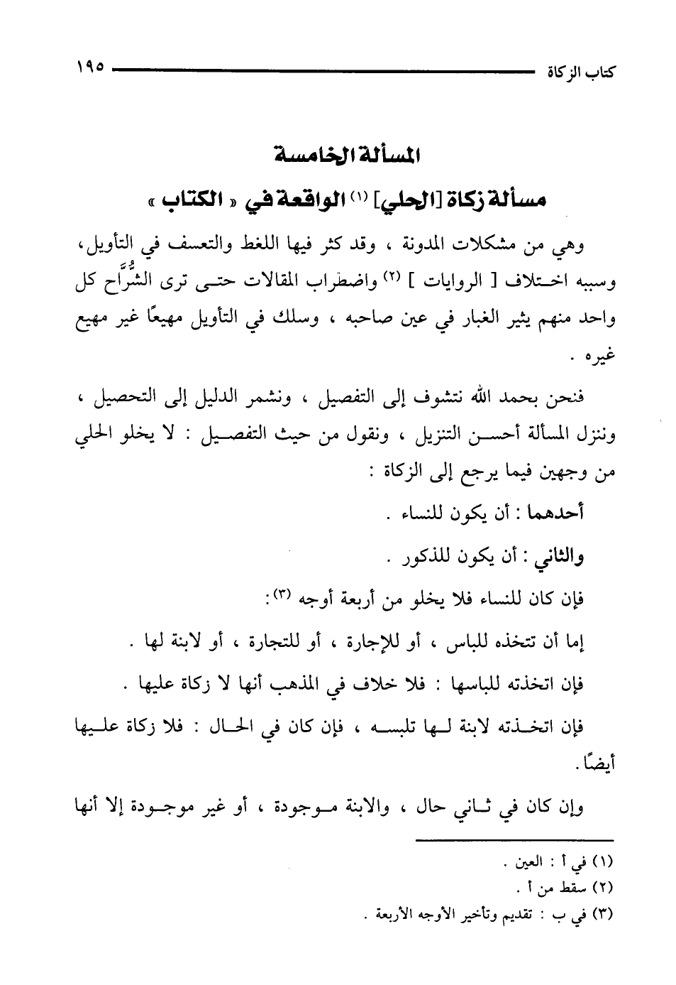 المسألة الخامسة مسألة زكاة [الحلي] (¬1) الواقعة في "الكتاب"