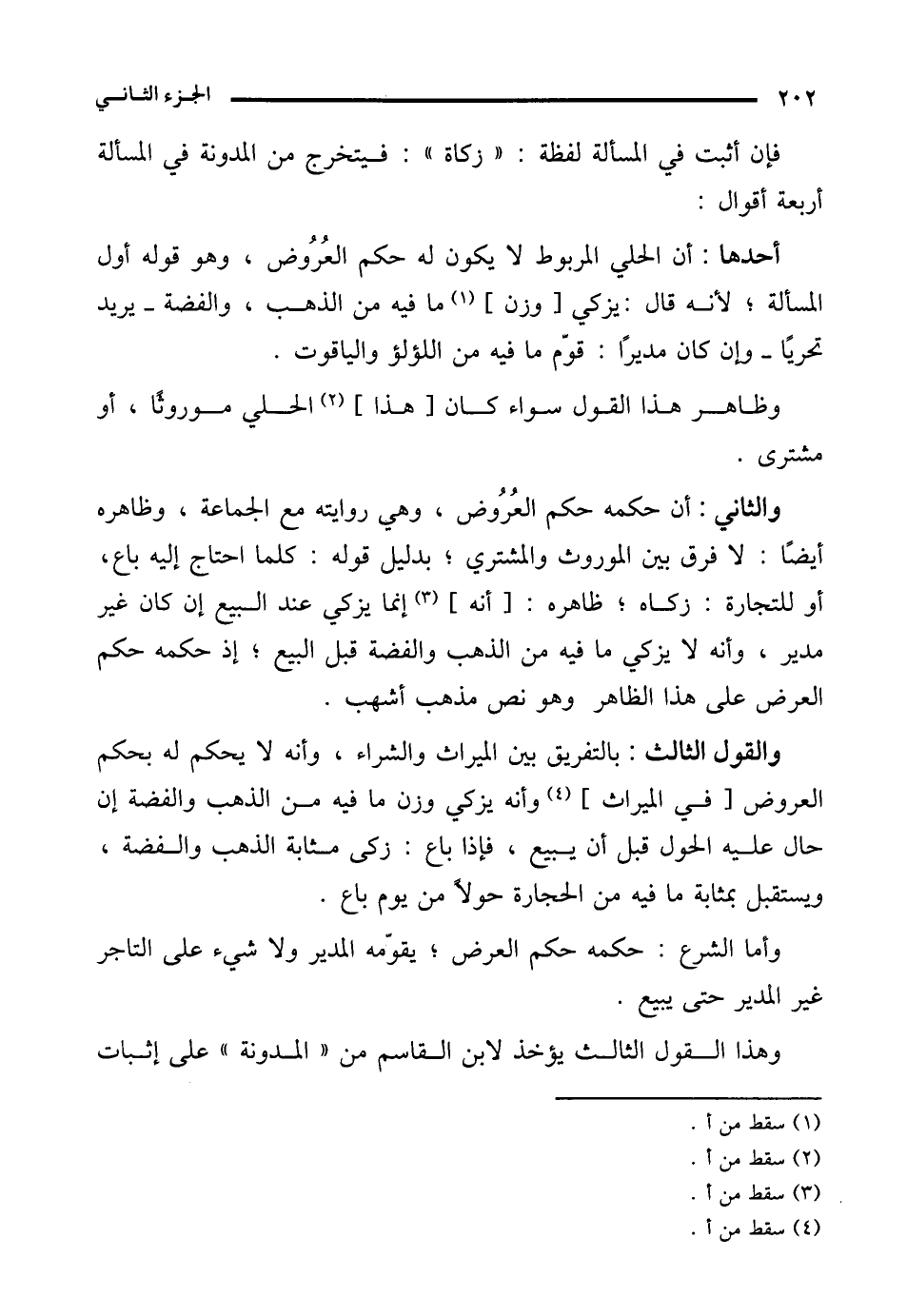 فإن أثبت في المسألة لفظة: "زكاة": فيتخرج من المدونة في المسألة أربعة أقوال:
