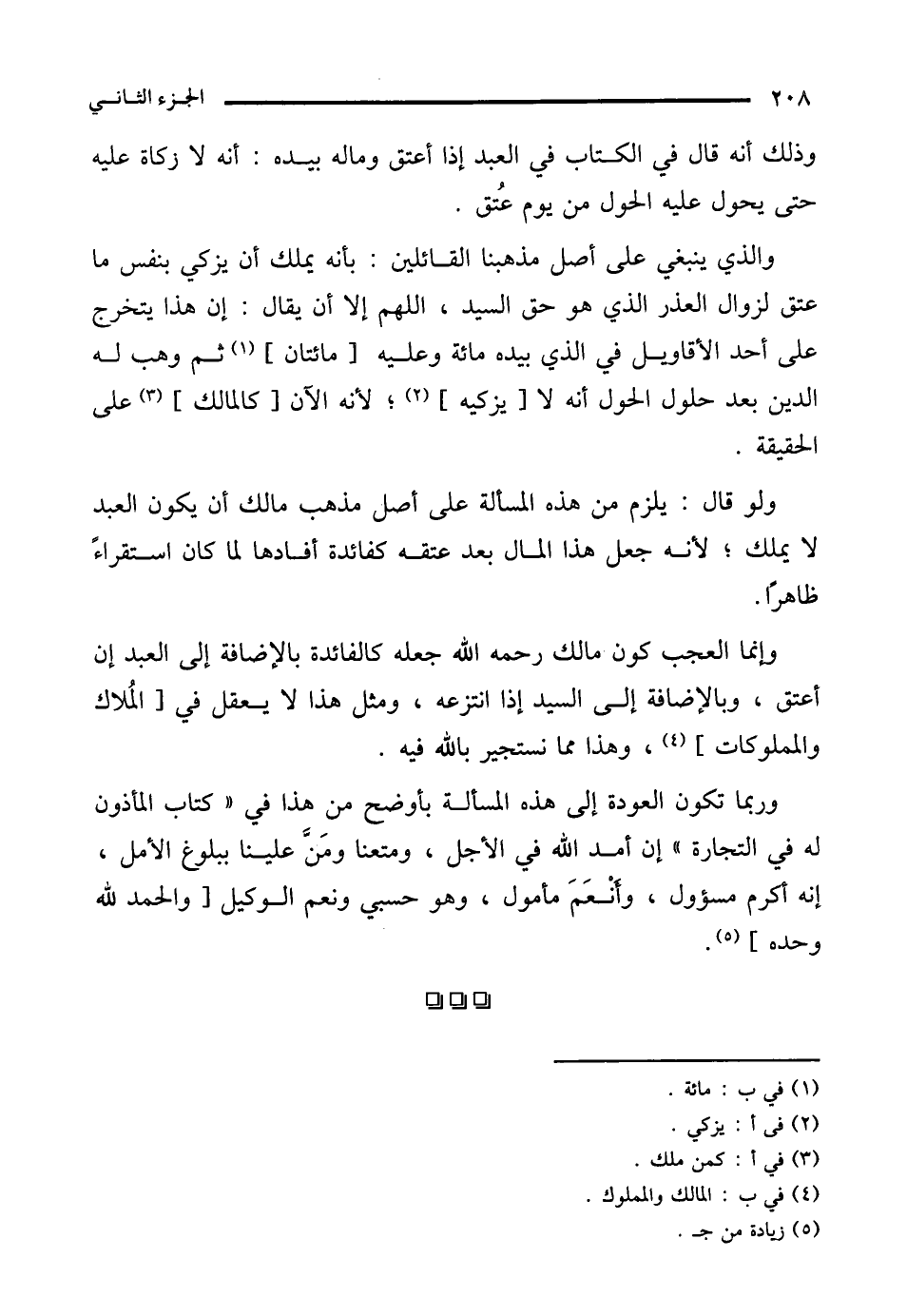 وربما تكون العودة إلى هذه المسألة بأوضح من هذا في "كتاب المأذون له في التجارة" إن أمد الله في الأجل، ومتعنا ومَنَّ علينا ببلوغ الأمل، إنه أكرم مسؤول، وأَنْعَمَ مأمول، وهو حسبي ونعم الوكيل [والحمد لله وحده] (¬5).