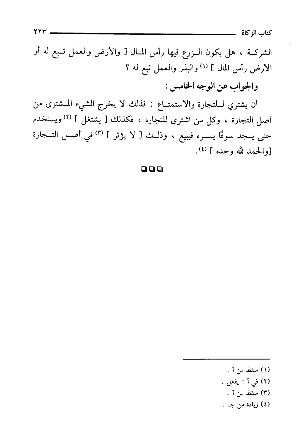 أن يشتري للتجارة والاستمتاع: فذلك لا يخرج الشيء المشترى من أصل التجارة، وكل من اشترى للتجارة، فكذلك [يشتغل] (¬2) ويستخدم حتى يجد سوقًا يسره فيبيع، وذلك [لا يؤثر] (¬3) في أصل التجارة [والحمد لله وحده] (¬4).