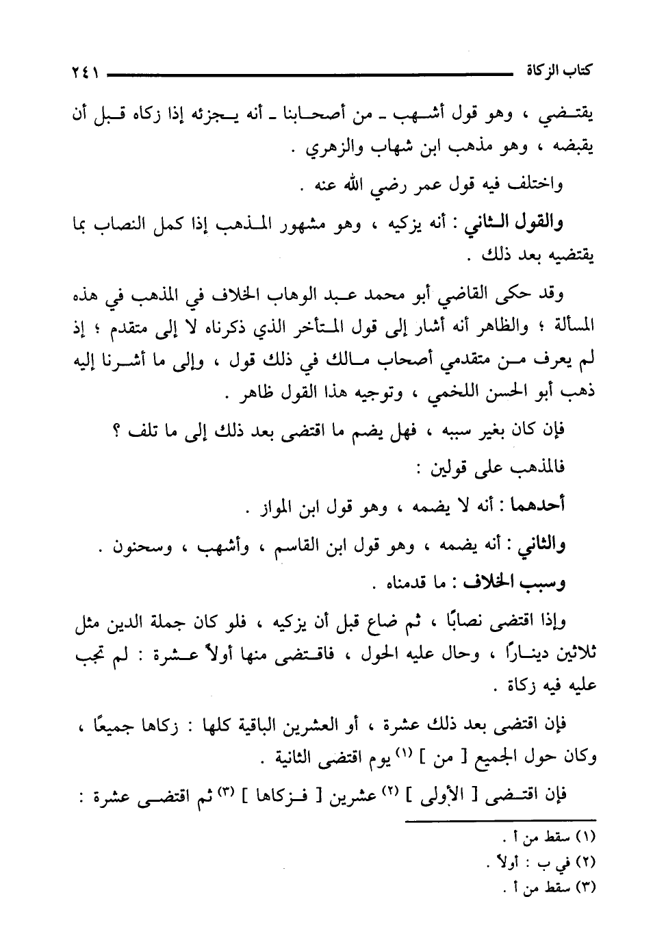 وقد حكى القاضي أبو محمَّد عبد الوهاب الخلاف في المذهب في هذه المسألة؛ والظاهر أنه أشار إلى قول المتأخر الذي ذكرناه لا إلى متقدم؛ إذ لم يعرف من متقدمي أصحاب مالك في ذلك قول، وإلى ما أشرنا إليه ذهب أبو الحسن اللخمي، وتوجيه هذا القول ظاهر.
