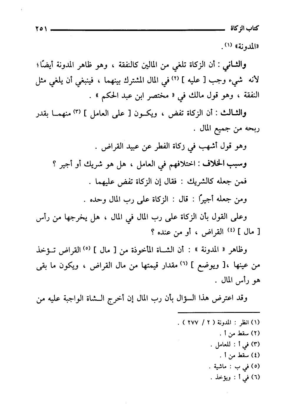 والثاني: أن الزكاة تلغي من المالين كالنفقة، وهو ظاهر المدونة أيضًا؛ لأنه شيء وجب [عليه] (¬2) في المال المشترك بينهما، فينبغي أن يلغي مثل النفقة، وهو قول مالك في "مختصر ابن عبد الحكم".