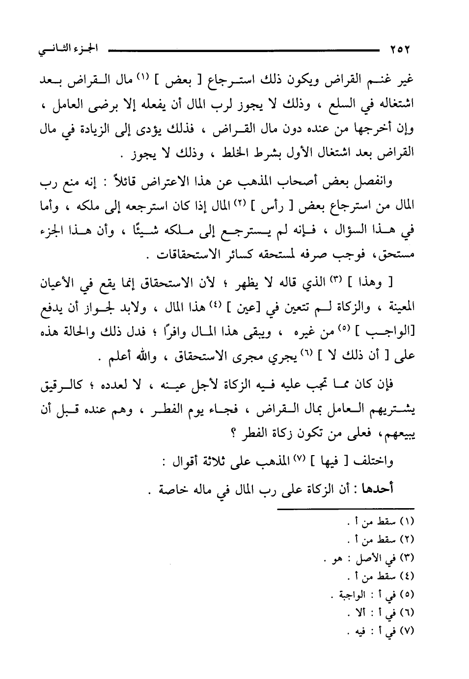 وانفصل بعض أصحاب المذهب عن هذا الاعتراض قائلًا: إنه منع رب المال من استرجاع بعض [رأس] (¬2) المال إذا كان استرجعه إلى ملكه، وأما في هذا السؤال، فإنه لم يسترجع إلى ملكه شيئًا، وأن هذا الجزء مستحق، فوجب صرفه لمستحقه كسائر الاستحقاقات.