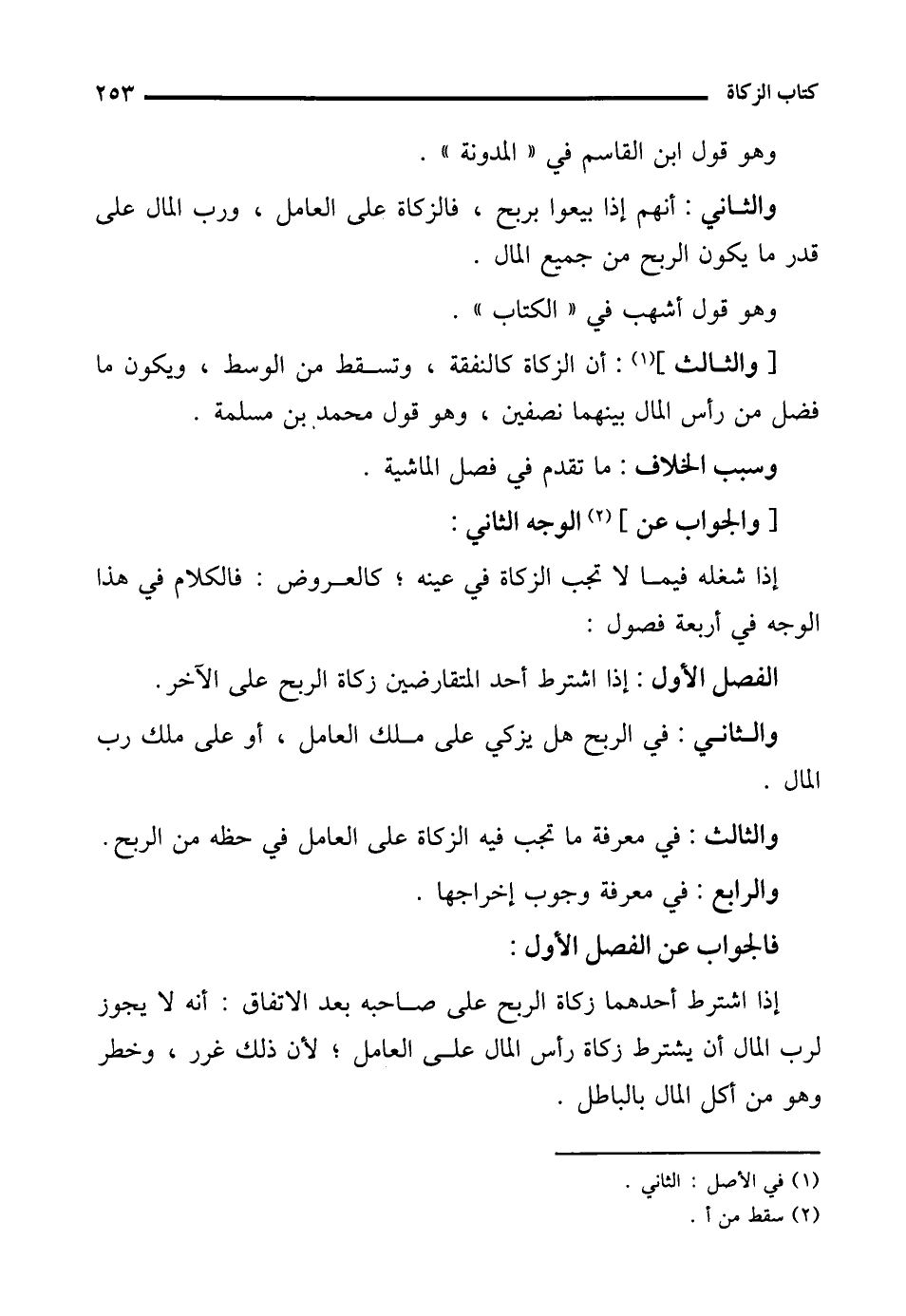 [والثالث] (¬1): أن الزكاة كالنفقة، وتسقط من الوسط، ويكون ما فضل من رأس المال بينهما نصفين، وهو قول محمَّد بن مسلمة.