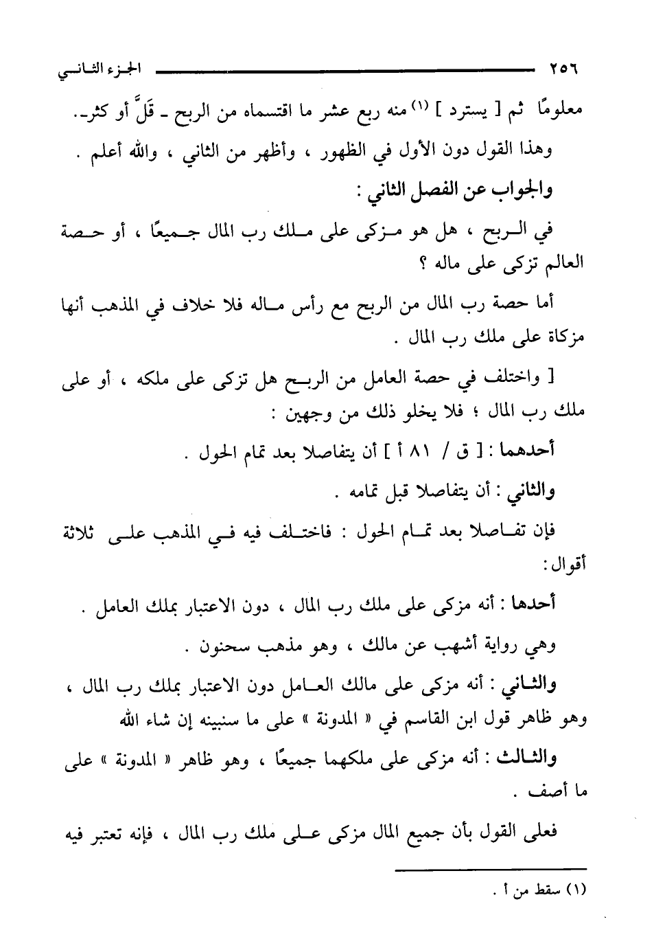 في الربح، هل هو مزكى على ملك رب المال جميعًا، أو حصة العالم تزكى على ماله؟