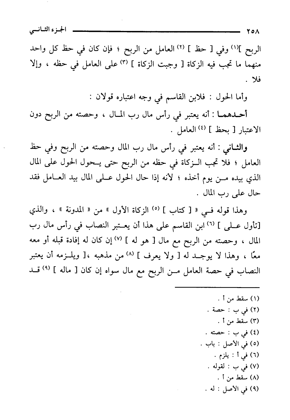 والثاني: أنه يعتبر في رأس مال رب المال وحصته من الربح وفي حظ العامل؛ فلا تجب الزكاة في حظه من الربح حتى يحول الحول على المال الذي بيده من يوم أخذه؛ لأنه إذا حال الحول على المال بيد العامل فقد حال على رب المال.