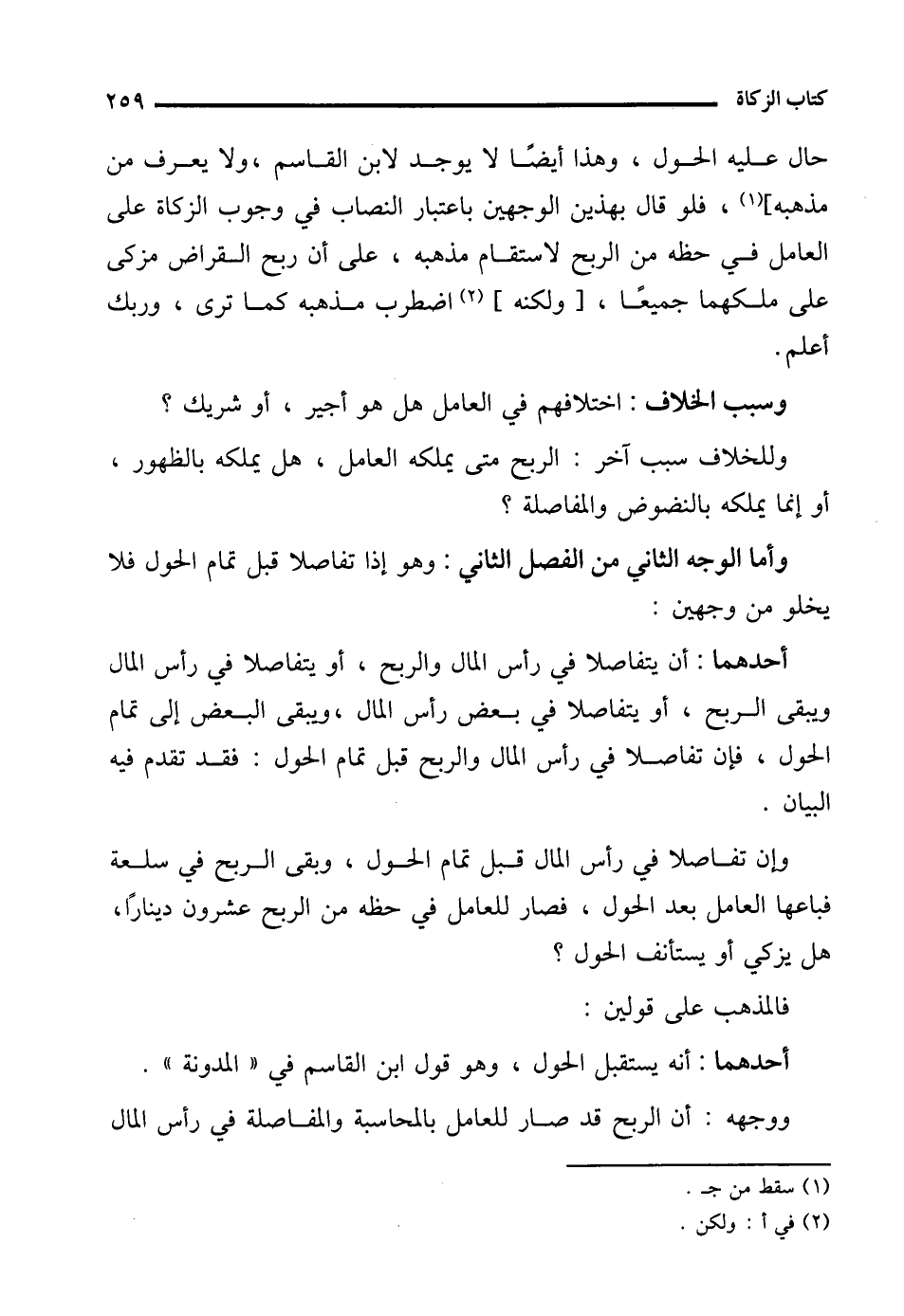 حال عليه الحول، وهذا أيضًا لا يوجد لابن القاسم، ولا يعرف من مذهبه] (¬1)، فلو قال بهذين الوجهين باعتبار النصاب في وجوب الزكاة على العامل في حظه من الربح لاستقام مذهبه، على أن ربح القراض مزكى على ملكهما جميعًا، [ولكنه] (¬2) اضطرب مذهبه كما ترى، وربك أعلم.