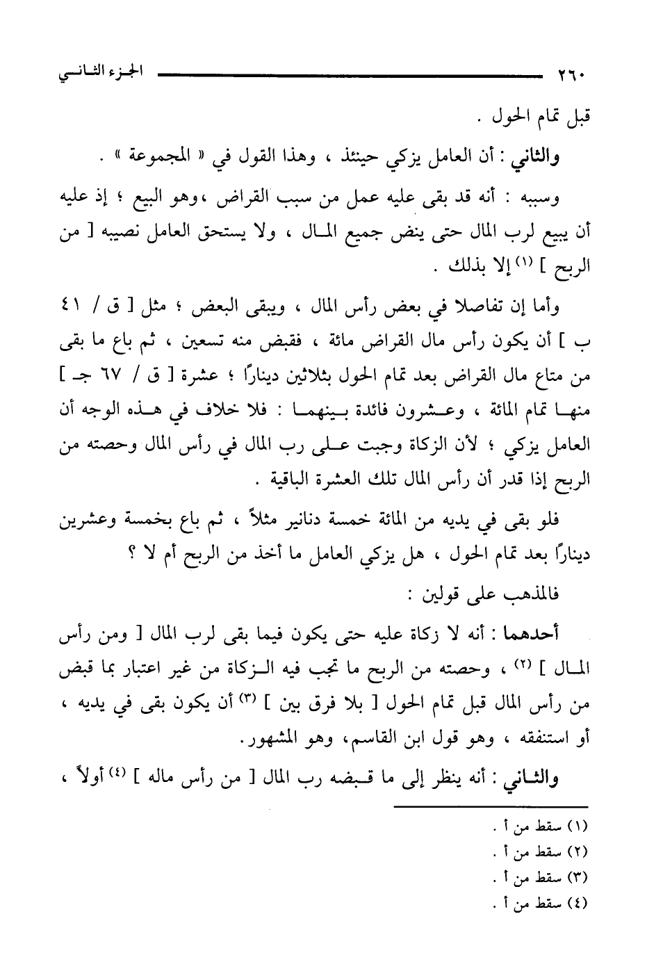 وأما إن تفاصلا في بعض رأس المال، ويبقى البعض؛ مثل أن يكون رأس مال القراض مائة، فقبض منه تسعين، ثم باع ما بقى من متاع مال القراض بعد تمام الحول بثلاثين دينارًا؛ عشرة منها تمام المائة، وعشرون فائدة بينهما: فلا خلاف في هذا الوجه أن العامل يزكي؛ لأن الزكاة وجبت على رب المال في رأس المال وحصته من الربح إذا قدر أن رأس المال تلك العشرة الباقية.
