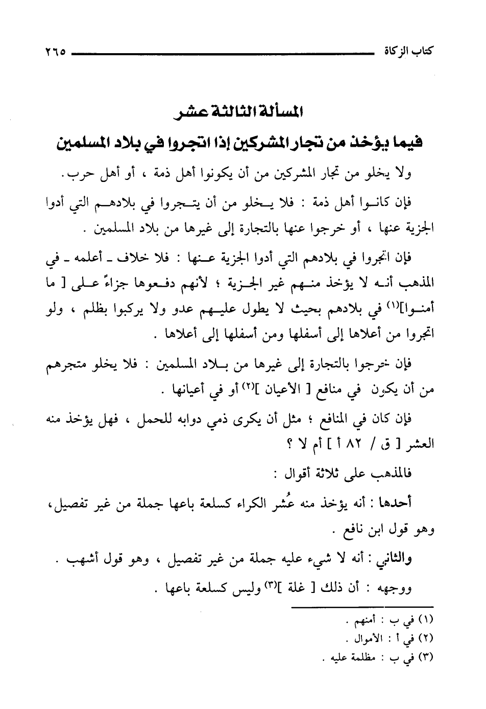 المسألة الثالثة عشر فيما يؤخذ من تجار المشركين إذا اتجروا في بلاد المسلمين