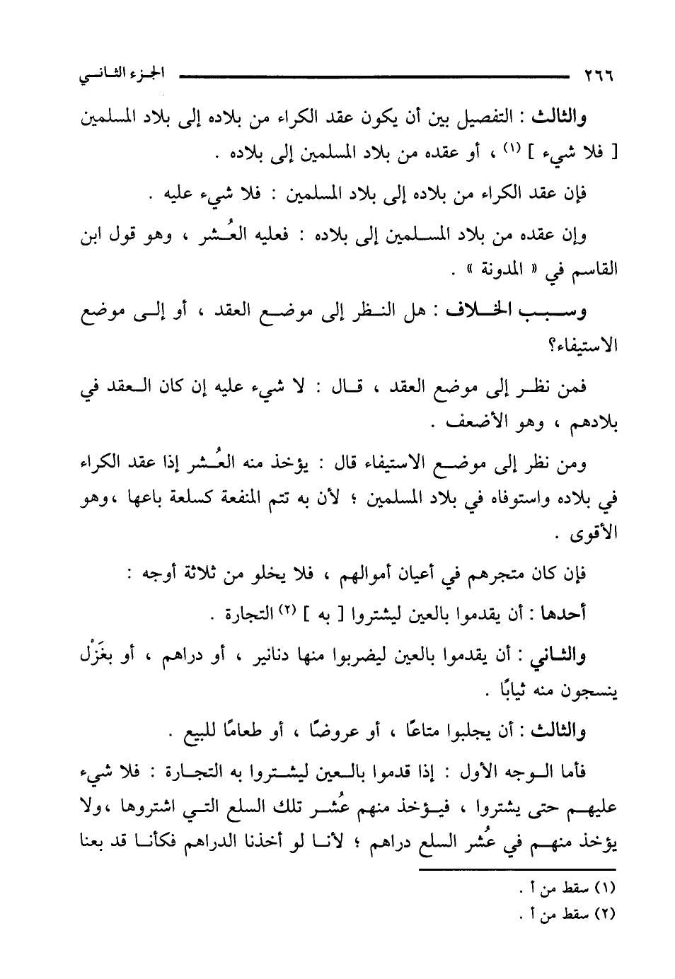 والثالث: التفصيل بين أن يكون عقد الكراء من بلاده إلى بلاد المسلمين [فلا شيء] (¬1)، أو عقده من بلاد المسلمين إلى بلاده.