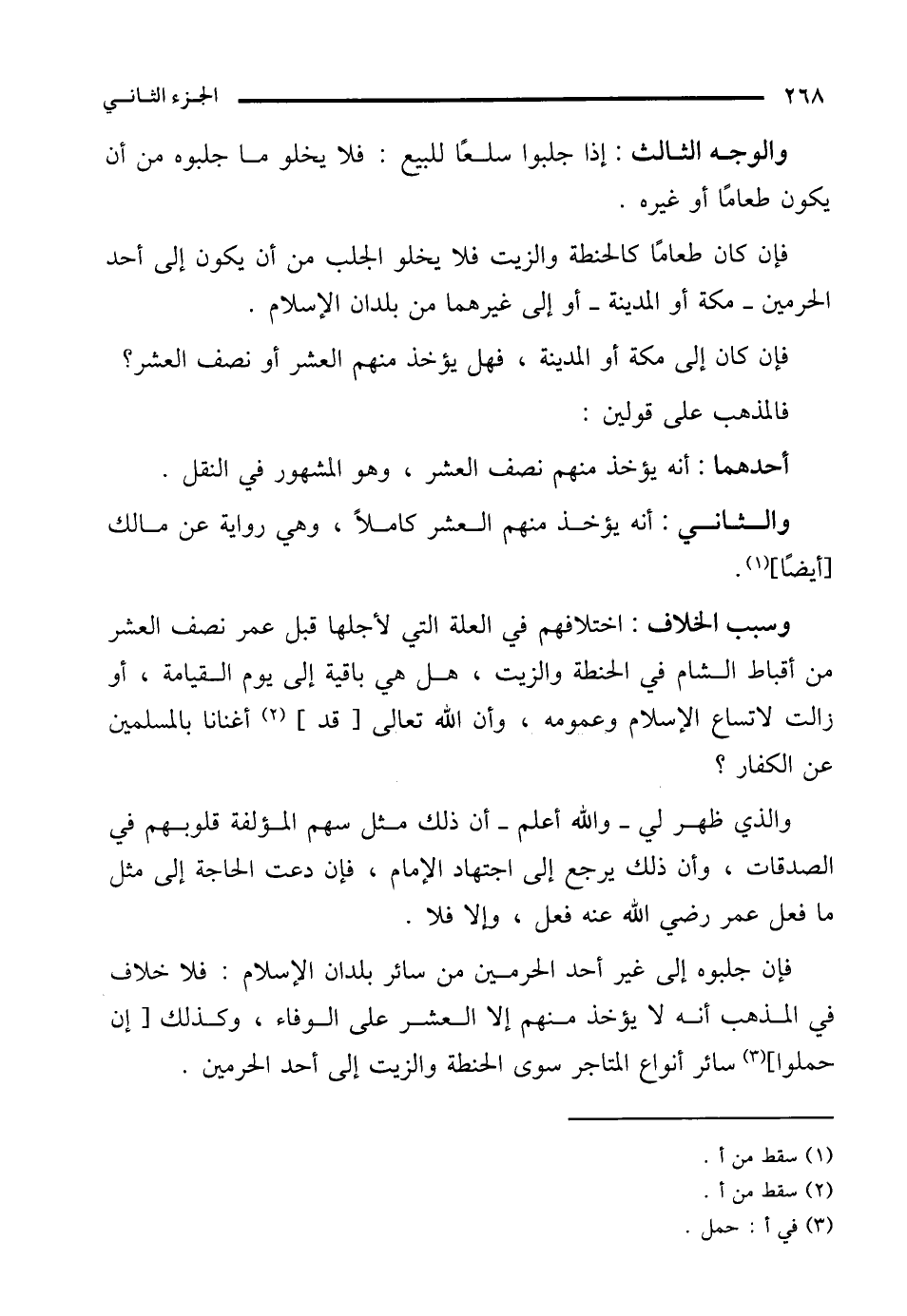 فإن جلبوه إلى غير أحد الحرمين من سائر بلدان الإِسلام: فلا خلاف في المذهب أنه لا يؤخذ منهم إلا العشر على الوفاء، وكذلك [إن حملوا] (¬3) سائر أنواع المتاجر سوى الحنطة والزيت إلى أحد الحرمين.