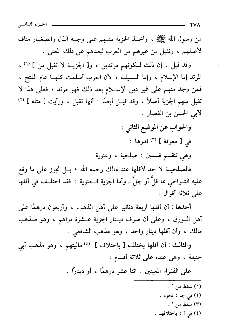 فالصلحية لا حد لأقلها عند مالك رحمه الله؛ بل تجوز على ما وقع عليه التراخي مما قلَّ أو جلَّ -وأما الجزية العنوية: فقد اختلف في أقلها على ثلاثة أقوال: