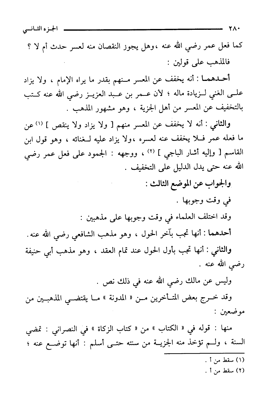 والثاني: أنه لا يخفف عن المعسر منهم [ولا يزاد ولا ينقص] (¬1) عن ما فعله عمر فلا يخفف عنه لعسره، ولا يزاد عليه لغنائه، وهو قول ابن القاسم [وإليه أشار الباجي] (¬2)، ووجهه: الجمود على فعل عمر رضي الله عنه حتى يدل الدليل على التخفيف.