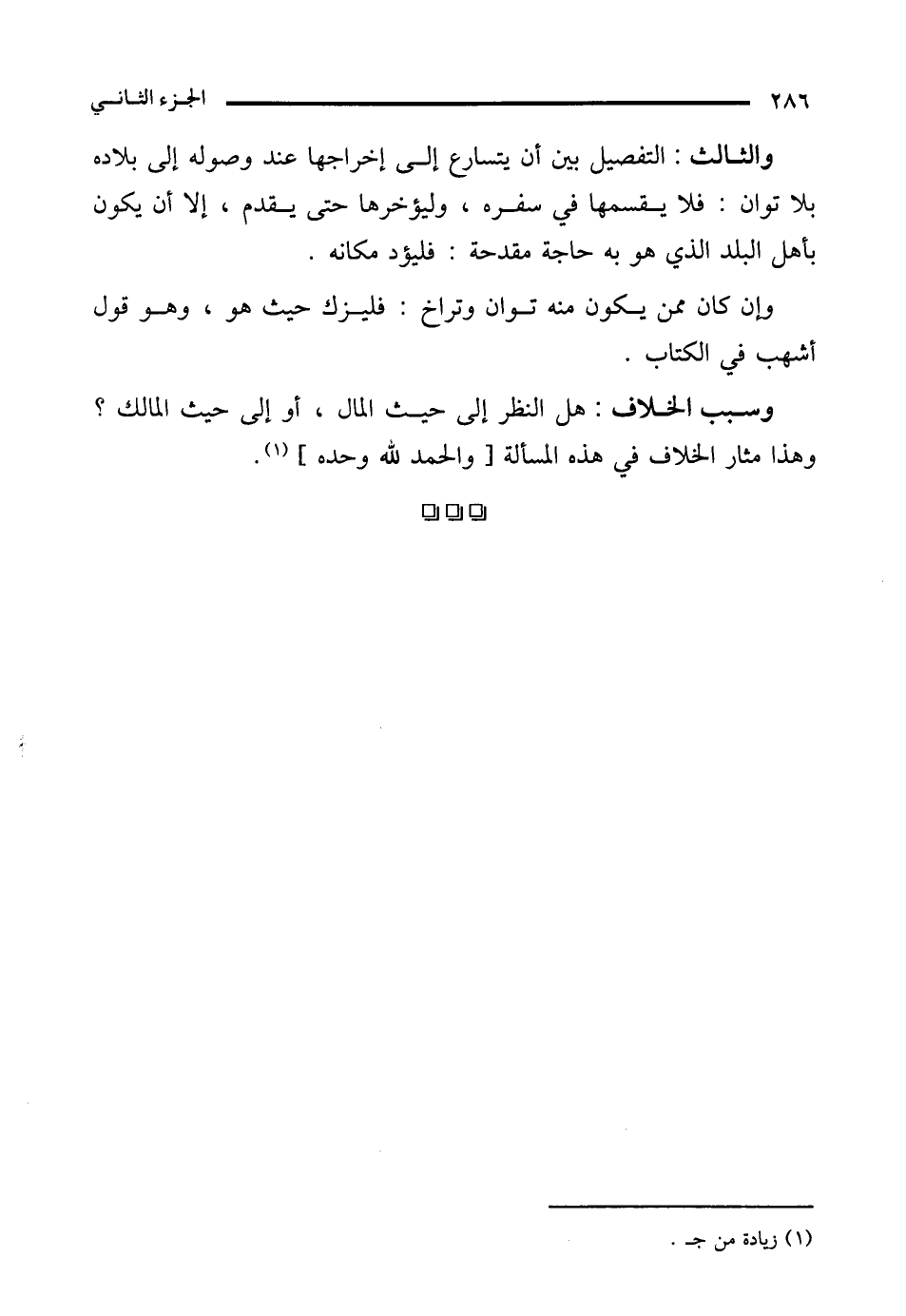 والثالث: التفصيل بين أن يتسارع إلى إخراجها عند وصوله إلى بلاده بلا توان: فلا يقسمها في سفره، وليؤخرها حتى يقدم، إلا أن يكون بأهل البلد الذي هو به حاجة مقدحة: فليؤد مكانه.