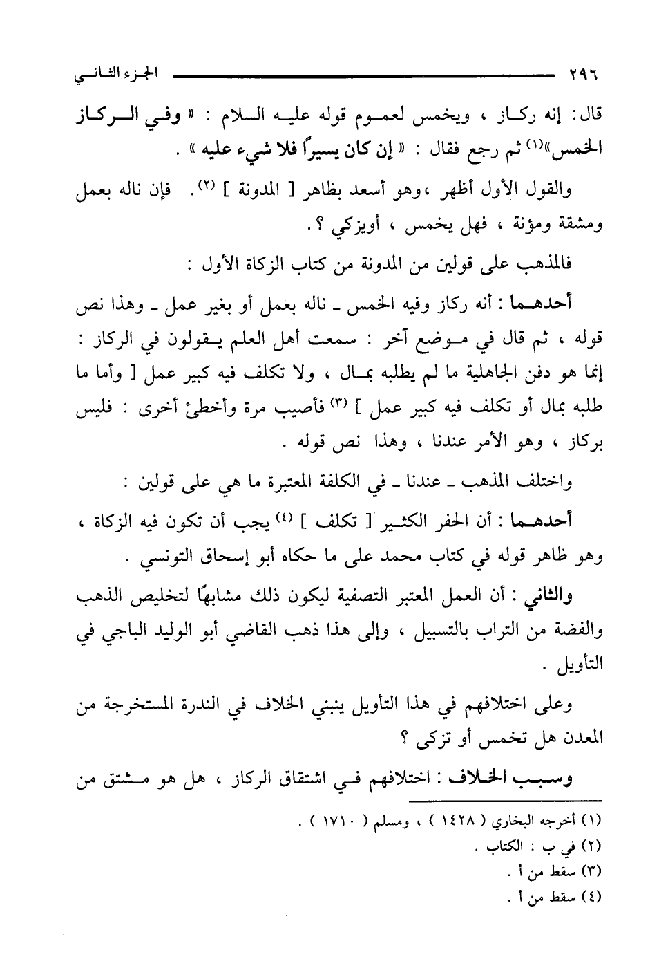 أحدهما: أن الحفر الكثير [تكلف] (¬4) يجب أن تكون فيه الزكاة، وهو ظاهر قوله في كتاب محمَّد على ما حكاه أبو إسحاق التونسي.