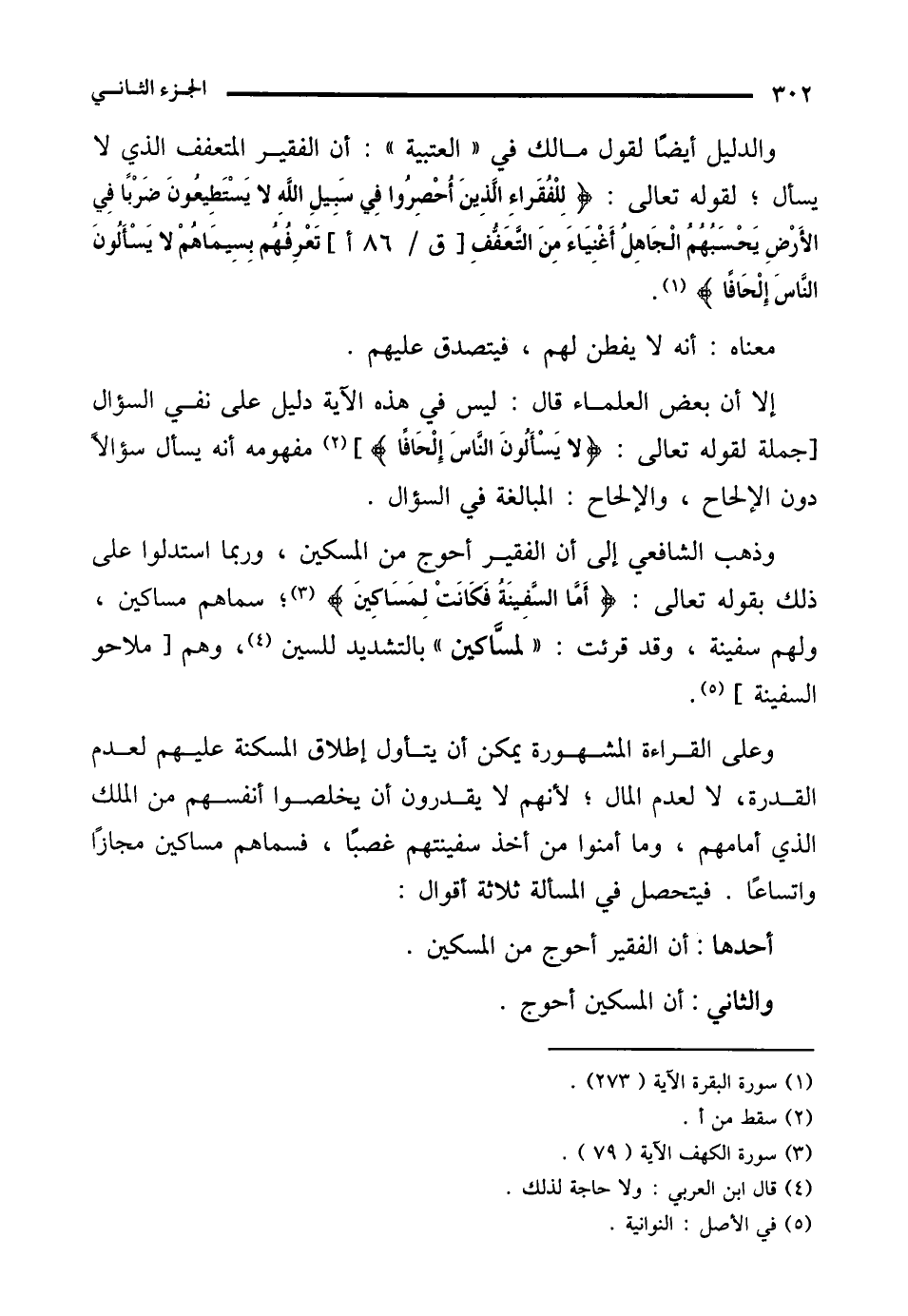 والدليل أيضًا لقول مالك في "العتبية": أن الفقير المتعفف الذي لا