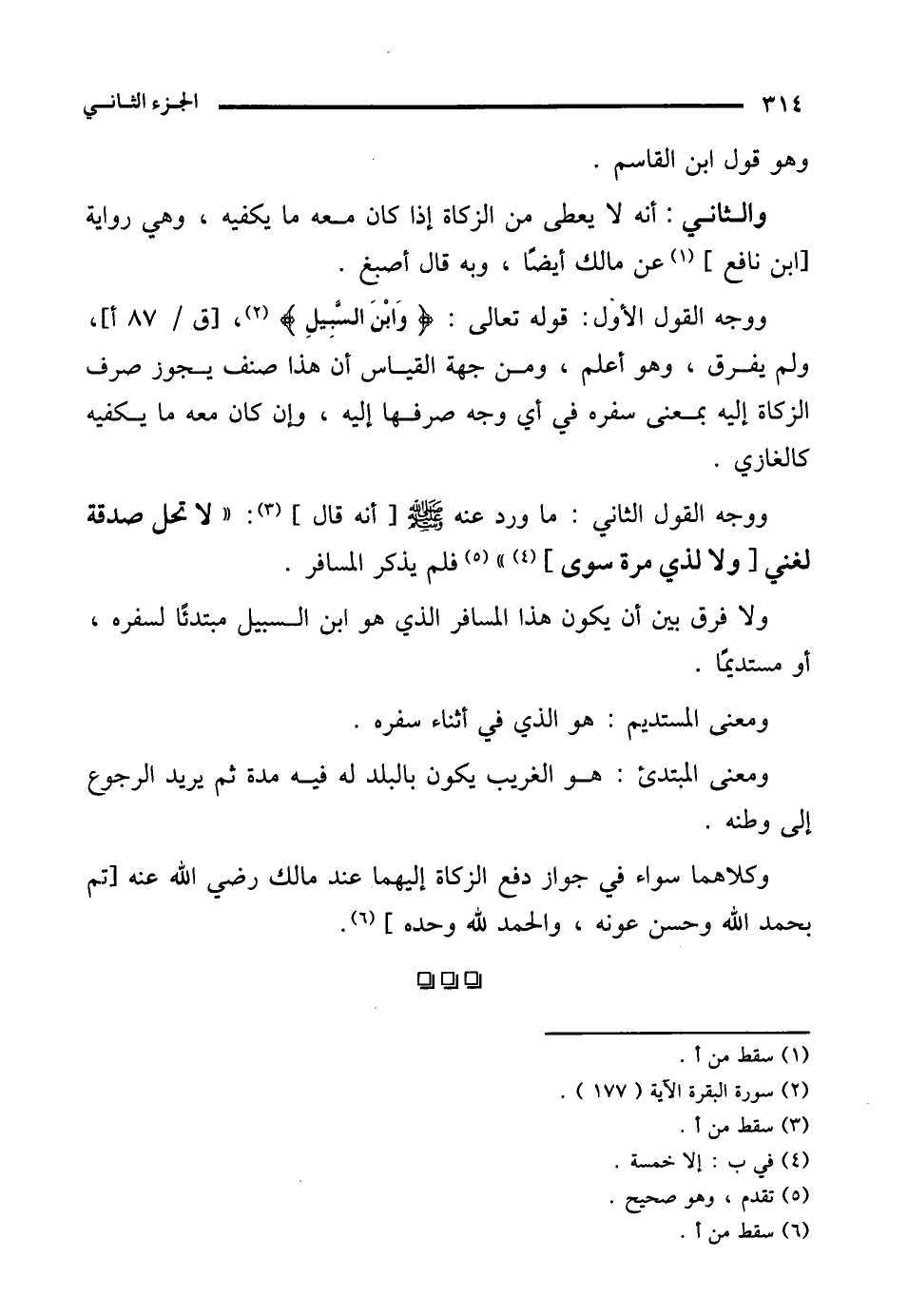 ووجه القول الثاني: ما ورد عنه - صلى الله عليه وسلم -[أنه قال] (¬3): "لا تحل صدقة لغني [ولا لذي مرة سوى] (¬4) " (¬5) فلم يذكر المسافر.