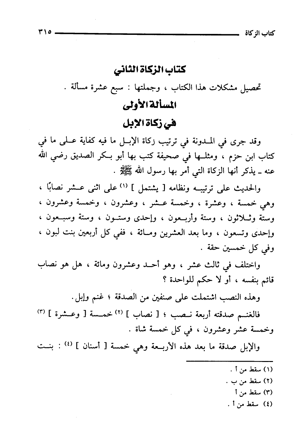 وقد جرى في المدونة في ترتيب زكاة الإبل ما فيه كفاية على ما في كتاب ابن حزم، ومثلها في صحيفة كتب بها أبو بكر الصديق رضي الله عنه -يذكر أنها الزكاة التي أمر بها رسول الله - صلى الله عليه وسلم -.