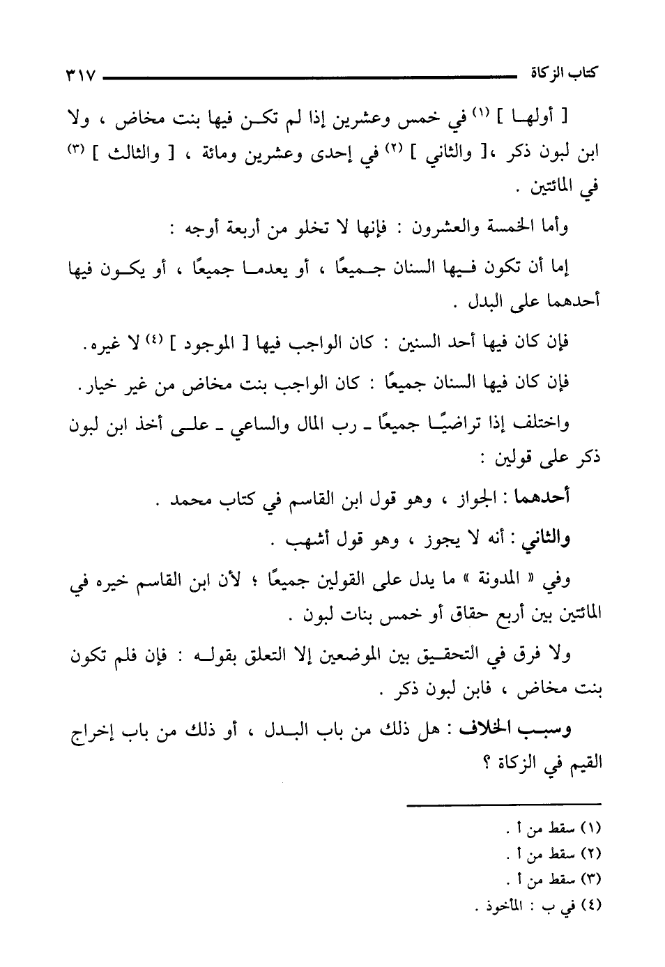 وفي "المدونة" ما يدل على القولين جميعًا؛ لأن أبن القاسم خيره في المائتين بين أربع حقاق أو خمس بنات لبون.