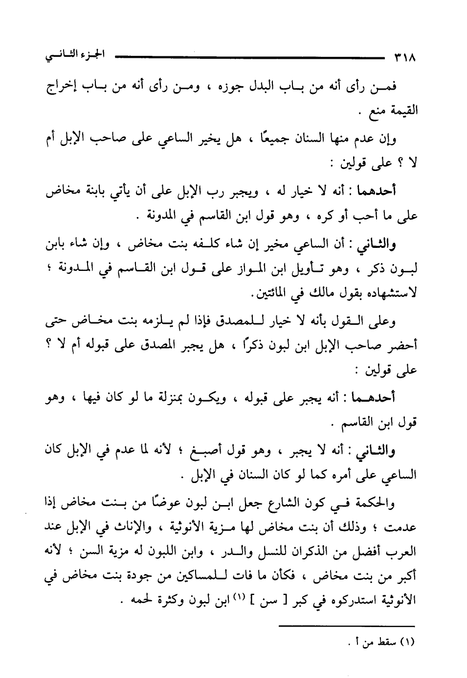 والثاني: أن الساعي مخير إن شاء كلفه بنت مخاض، وإن شاء بابن لبون ذكر، وهو تأويل ابن المواز على قول ابن القاسم في المدونة؛ لاستشهاده بقول مالك في المائتين.