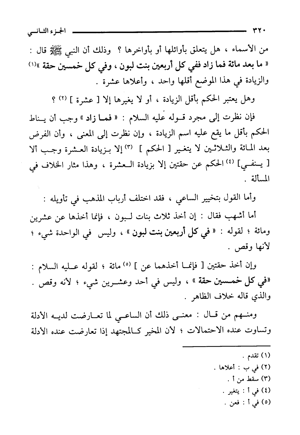 فإن نظرت إلى مجرد قوله عليه السلام: "فما زاد" وجب أن يناط الحكم بأقل ما يقع عليه اسم الزيادة، وإن نظرت إلى المعنى، وأن الفرض بعد المائة والثلاثين لا يتغير [الحكم] (¬3) إلا بزيادة العشرة وجب ألا [ينفي] (¬4) الحكم عن حقتين إلا بزيادة العشرة، وهذا مثار الخلاف في المسألة.