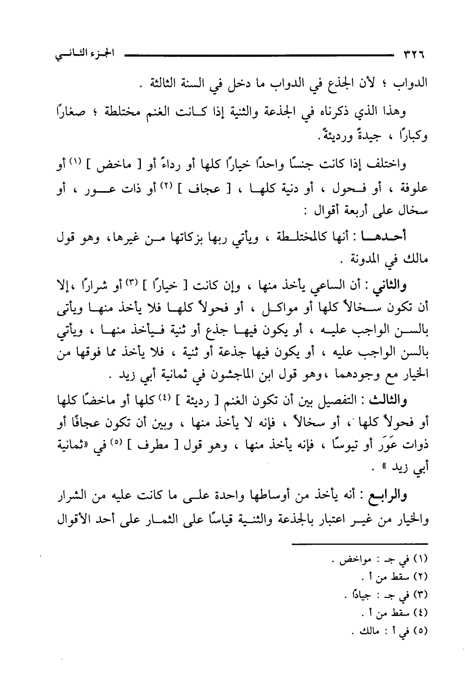 والثالث: التفصيل بين أن تكون الغنم [رديئة] (¬4) كلها أو ماخضًا كلها أو فحولًا كلها، أو سخالًا، فإنه لا يأخذ منها، وبين أن تكون عجافًا أو ذوات عَوَر أو تيوسًا، فإنه يأخذ منها، وهو قول [مطرف] (¬5) في "ثمانية أبي زيد".