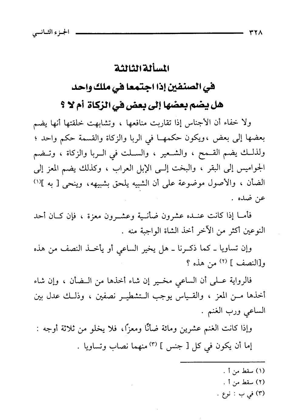المسألة الثالثة في الصنفين إذا اجتمعا في ملك واحد هل يضم بعضها إلى بعض في الزكاة أم لا؟
