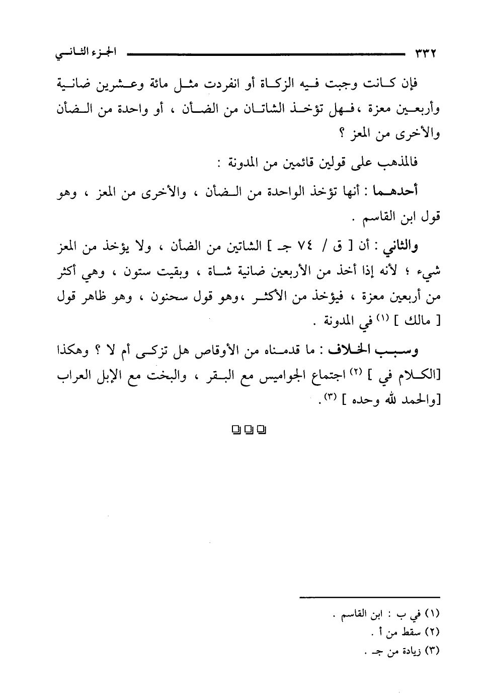 والثاني: أن الشاتين من الضأن، ولا يؤخذ من المعز شيء؛ لأنه إذا أخذ من الأربعين ضانية شاة، وبقيت ستون، وهي أكثر من أربعين معزة، فيؤخذ من الأكثر، وهو قول سحنون، وهو ظاهر قول [مالك] (¬1) في المدونة.