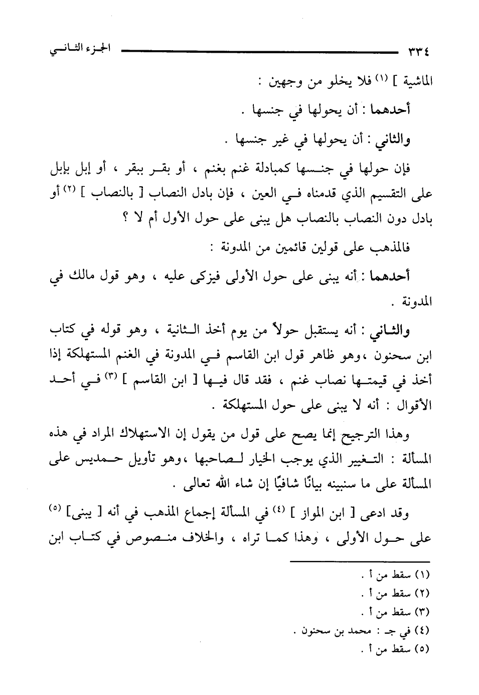 والثاني: أنه يستقبل حولًا من يوم أخذ الثانية، وهو قوله في كتاب ابن سحنون، وهو ظاهر قول ابن القاسم في المدونة في الغنم المستهلكة إذا أخذ في قيمتها نصاب غنم، فقد قال فيها [ابن القاسم] (¬3) في أحد الأقوال: أنه لا يبنى على حول المستهلكة.