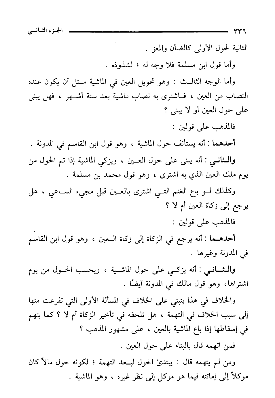 والثاني: أنه يبنى على حول العين، ويزكي الماشية إذا تم الحول من يوم ملك العين الذي به اشترى، وهو قول محمد بن مسلمة.
