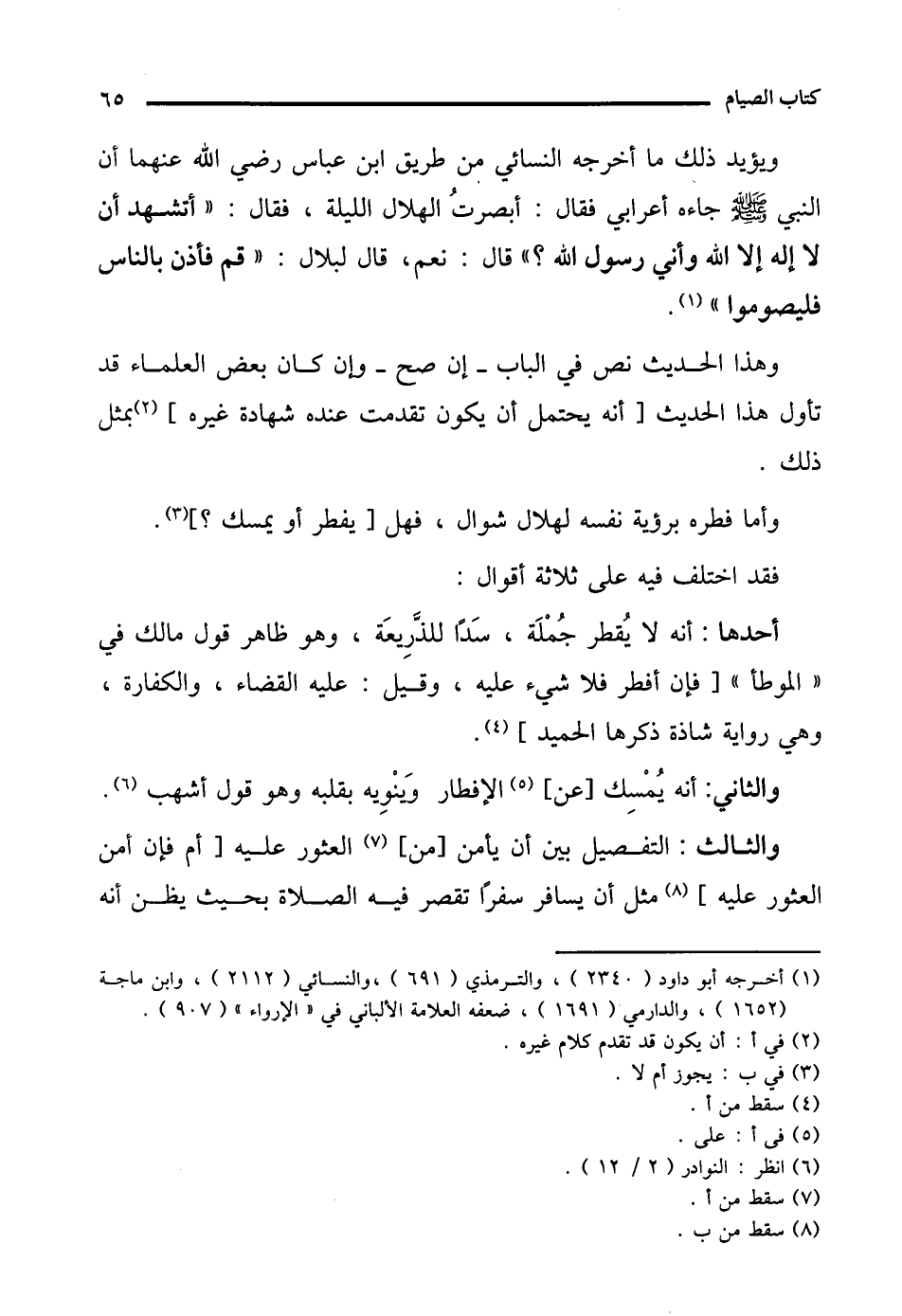 ويؤيد ذلك ما أخرجه النسائي من طريق ابن عباس رضي الله عنهما أن النبي - صلى الله عليه وسلم - جاءه أعرابي فقال: أبصرتُ الهلال الليلة، فقال: "أتشهد أن لا إله إلا الله وأني رسول الله؟ " قال: نعم، قال لبلال: "قم فأذن بالناس فليصوموا" (¬1).