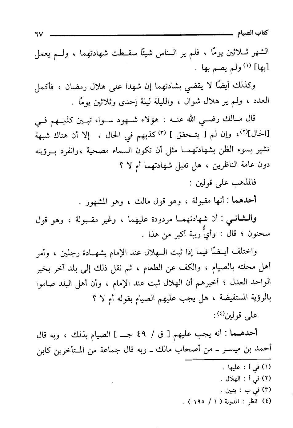 واختلف أيضًا فيما إذا ثبت الهلال عند الإِمام بشهادة رجلين، وأمر أهل محلته بالصيام، والكف عن الطعام، ثم نقل ذلك إلى بلد آخر بخبر الواحد العدل؛ أخبرهم أن الهلال ثبت عند الإِمام، وأن أهل البلد صاموا بالرؤية المستفيضة، هل يجب عليهم الصيام بقوله أم لا؟