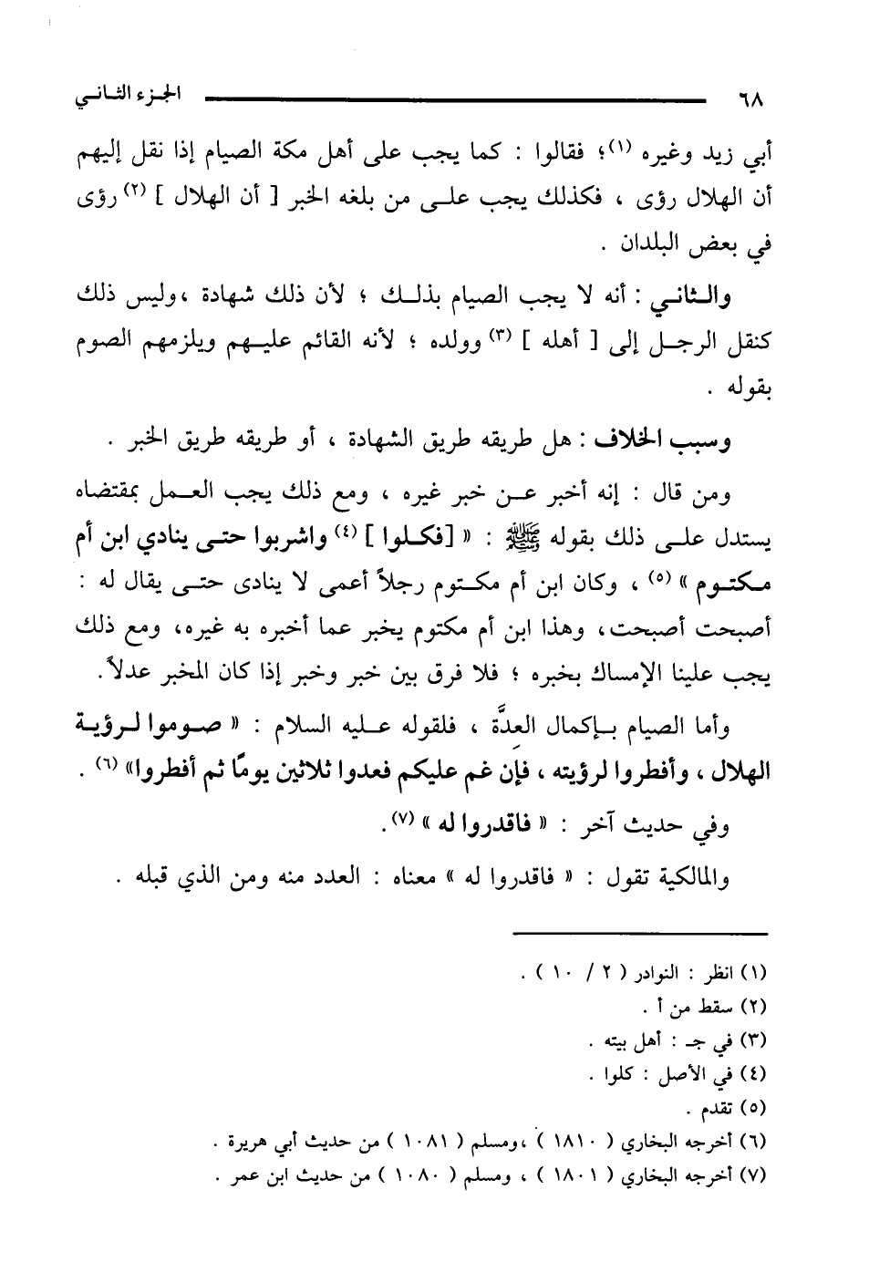 أبي زيد وغيره (¬1)؛ فقالوا: كما يجب على أهل مكة الصيام إذا نقل إليهم أن الهلال رؤى، فكذلك يجب على من بلغه الخبر [أن الهلال] (¬2) رؤى في بعض البلدان.