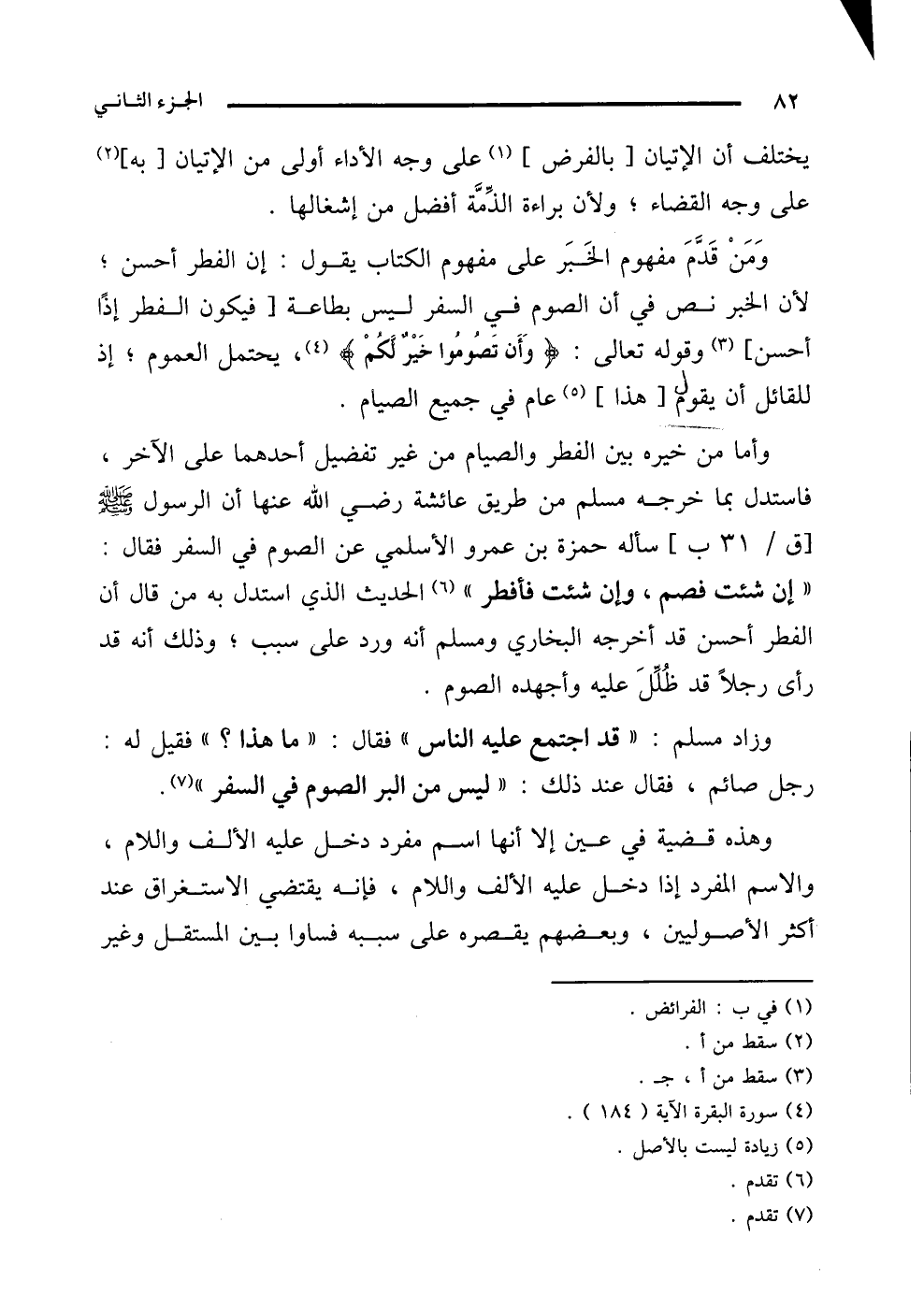 وَمَنْ قَدَّمَ مفهوم الخَبَر على مفهوم الكتاب يقول: إن الفطر أحسن؛ لأن الخبر نص في أن الصوم في السفر ليس بطاعة [فيكون الفطر إذًا أحسن] (¬3) وقوله تعالى: {وَأَنْ تَصُومُوا خَيْرٌ لَكُمْ} (¬4)، يحتمل العموم؛ إذ للقائل أن يقول [هذا] (¬5) عام في جميع الصيام.