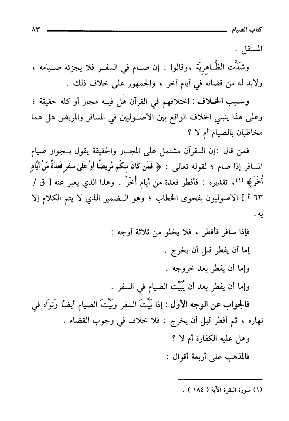 فمن قال: إن القرآن مشتمل على المجاز والحقيقة يقول بجواز صيام المسافر إذا صام؛ لقوله تعالى: {فَمَنْ كَانَ مِنْكُمْ مَرِيضًا أَوْ عَلَى سَفَرٍ فَعِدَّةٌ مِنْ أَيَّامٍ أُخَرَ} (¬1)، تقديره: فأفطر فعدة من أيام أُخَرْ. وهذا الذي يعبر عنه [ق/ 63 أ] الأصوليون بفحوى الخطاب؛ وهو الضمير الذي لا يتم الكلام إلا به.