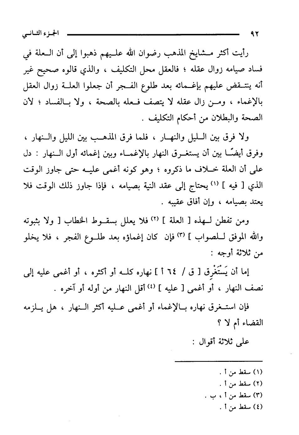 رأيت أكثر مشايخ المذهب رضوان الله عليهم ذهبوا إلى أن العلة في فساد صيامه زوال عقله؛ فالعقل محل التكليف، والذي قالوه صحيح غير أنه ينتقض عليهم بإغمائه بعد طلوع الفجر أن جعلوا العلة زوال العقل بالإغماء، ومن زال عقله لا يتصف فعله بالصحة، ولا بالفساد؛ لأن الصحة والبطلان من أحكام التكليف.