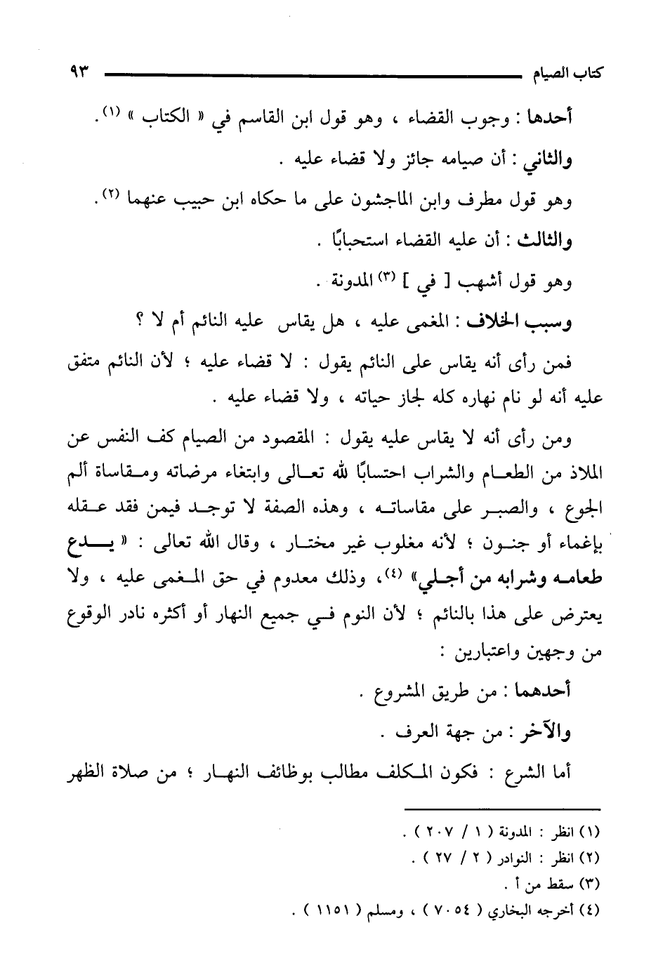 ومن رأى أنه لا يقاس عليه يقول: المقصود من الصيام كف النفس عن الملاذ من الطعام والشراب احتسابًا لله تعالى وابتغاء مرضاته ومقاساة ألم الجوع، والصبر على مقاساته، وهذه الصفة لا توجد فيمن فقد عقله بإغماء أو جنون؛ لأنه مغلوب غير مختار، وقال الله تعالى: "يدع طعامه وشرابه من أجلي" (¬4)، وذلك معدوم في حق المغمى عليه، ولا يعترض على هذا بالنائم؛ لأن النوم في جميع النهار أو أكثره نادر الوقوع من وجهين واعتبارين: