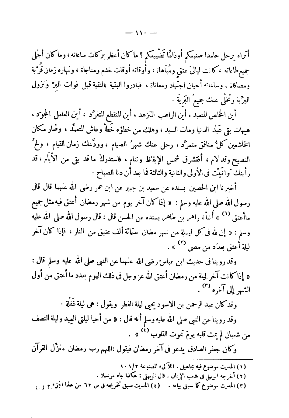 | أتراه يرحل حامدا صنيعكم أو ذاما تضييعكم ؟ ما كان أعظم بركات ساعاته ، وما كان أحلى | جميع طاعاته ، كانت ليالي عتق ومباهاة ، وأوقاته أوقات خدم ومناجاة ، ونهاره زمان قربة | ومصافاة ، وساعاته أحيان اجتهاد ومعاناة ، فبادروا البقية بالتقية قبل فوات البر ونزول | البرية وتخلي عنك جميع البرية . | | أين المخلص المتعبد ، أين الراهب المتزهد ، أين المنقطع المتفرد ، أين العامل المجود ، | هيهات بقي عبد الدنيا ومات السيد ، وهلك من خطؤه خطأ وعاش المتعمد ، وصار مكان | الخاشعين كل منافق متمرد ، رحل عنك شهر الصيام ، وودعك زمان القيام ، ولح | النصيح وقد لام ، أفتشرق شمس الإيقاظ وتنام ، فاستدرك ما قد بقى من الأيام ، قد | رأيتك توانيت في الأولى والثانية والثالثة فما بعد أن دنا الصباح . | | أخبرنا ابن الحصين بسنده عن سعيد بن جبير عن ابن عمر رضي الله عنهما قال قال | رسول الله صلى الله عليه وسلم : ' إذا كان آخر يوم من شهر رمضان أعتق فيه مثل | جميع ما أعتق ' أنبأنا زاهر بن طاهر بسنده عن الحسن قال : قال رسول الله صلى الله عليه وسلم | ' إن لله في كل ليلة من شهر رمضان ستمائة ألف عتيق من النار ، فإذا كان آخر | ليلة أعتق بعدد من مضى ' . | | وقد روينا في حديث ابن عباس رضي الله عنهما عن النبي صلى الله عليه وسلم قال : | ' إذا كانت آخر ليلة من رمضان أعتق الله عز وجل في ذلك اليوم بعدد ما أعتق من أول | الشهر إلى آخره ' . | | وقد كان عبد الرحمن بن الأسود يحيي ليلة الفطر ويقول : هي ليلة غفلة . | | وقد روينا عن النبي صلى الله عليه وسلم أنه قال : ' من أحيا ليلتي العيد وليلة النصف | من شعبان لم يمت قلبه يوم تموت القلوب ' . | | وكان جعفر الصادق يدعو في آخر رمضان فيقول : اللهم رب رمضان منزل القرآن |
