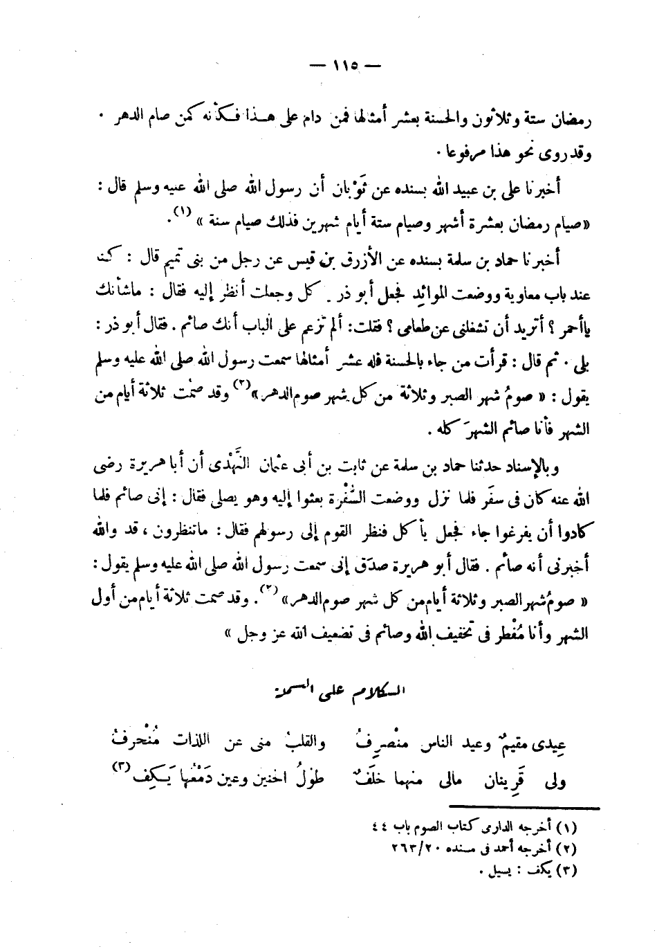| رمضان ستة وثلاثون والحسنة بعشر أمثالها فمن دام على هذا فكأنه كمن صام الدهر . | وقد روي نحو هذا مرفوعاً . | | أخبرنا علي بن عبيد الله بسنده عن ثوبان أن رسول الله صلى الله عليه وسلم قال : | ' صيام رمضان بعشرة أشهر وصيام ستة أيام شهرين فذلك صيام سنة ' . | | أخبرنا حماد بن سلمة بسنده عن الأزرق بن قيس عن رجل من بني تميم قال : كنا | عند باب معاوية ووضعت الموائد فجعل أبو ذر . يأكل وجعلت أنظر إليه فقال : ما شأنك | يا أحمر ؟ أتريد أن تشغلني عن طعامي ؟ فقلت : ألم تزعم على الباب أنك صائم . فقال أبو ذر : | بلى . ثم قال : قرأت من جاء بالحسنة فله عشر أمثالها سمعت رسول الله صلى الله عليه وسلم | يقول : ' صوم شهر الصبر و ثلاثة من كل شهر صوم الدهر ' وقد صمت ثلاثة أيام من الشهر فأنا صائم الشهر كله . | | وبالإسناد حدثنا حماد بن سلمة بن أبي عثمان النهدي أن أبا هريرة رضي | الله عنه كان في سفر فلما نزل ووضعت السفرة بعثوا إليه وهو يصلي فقال : إني صائم فلما | كادوا أن يفرغوا جاء فجعل يأكل فنظر القوم إلى رسولهم فقال : ما تنظرون ، قد والله | أخبرني أنه صائم . فقال أبو هريرة صدق إني سمعت رسول الله صلى الله عليه وسلم يقلو : ' صوم شهر الصبر وثلاثة أيام من كل شهر صوم الدهر ' . وقد صمت ثلاثة أيام من أول | الشهر وأنا مفطر في تخفيف الله وصائم في تضعيف الله عز وجل . | الكلام على البسملة | | ( عيدي مقيم وعيد الناس منصرف % والقلت مني عن اللذات منحرف ) % | | ( ولي قرينان مالي منهما خلف % طول الحنين وعين دمعها يكف ) % |