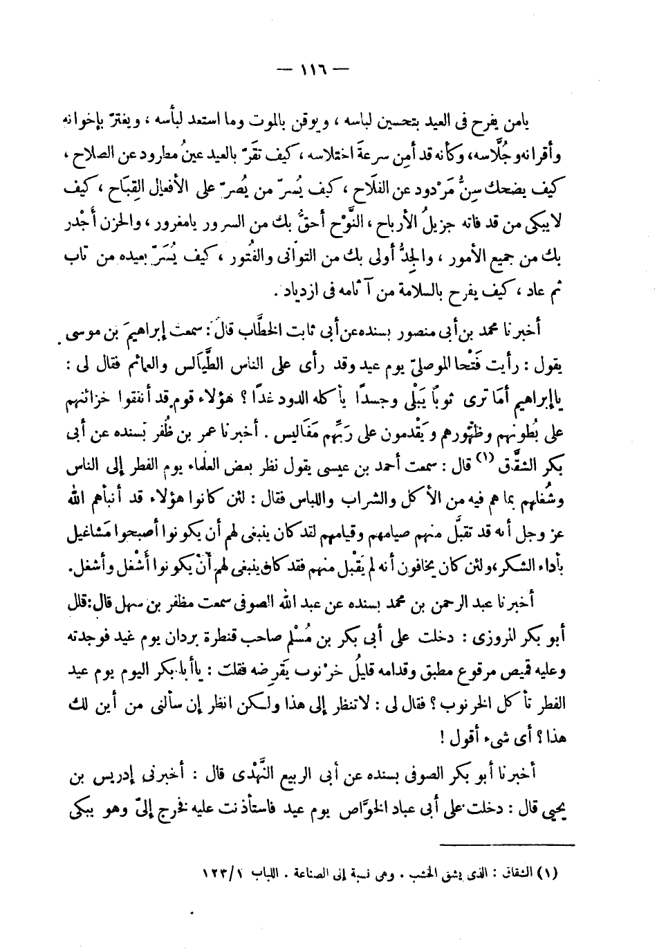 | | يا من يفرح في العيد بتحسين لباسه ، ويوقن بالموت وما استعد لبأسه ، ويغتر بإخوانه | وأقرانه وجلاسه ، وكأنه قد أمن سرعة اختلاسه ، كيف تقر بالعيد عين مطرود عن الصلاح ، | كيف يضحك سن مردود عن الفلاح ، كيف يسر من يصر على الأفعال القباح ، كيف | لا يبكي من قد فاته جزيل الأرباح ، النوح أحق بك من السرور يا مغرور ، والحزن أجدر | بك من جميع الأمور ، والجد أولى بك من التواني والفتور ، كيف يسر بعيده من تاب | ثم عاد ، كيف يفرح بالسلامة من آثامه في ازدياد . | | أخبرنا محمد بن أبي منصور بسنده عن أبي ثابت الخطاب قال : سمعت إبراهيم بن موسى | يقول : رأيت فتحا الموصلي يوم عيد وقد رأى على الناس الطيالس والعمائم فقال لي : | يا إبراهيم أما ترى ثوبا يبلى وجسدا يأكله الدود غداً ؟ هؤلاء قوم قد أنفقوا خزائنهم | على بطونهم وظهورهم ويقدمون على ربهم مفاليس . أخبرنا عمر بن ظفر بسنده عن أبي | بكر الشقاق قال : سمعت أحمد بن عيسى يقول : نظر بعض العلماء يوم الفطر إلى الناس | وشغلهم بما هم فيه من الأكل والشراب واللباس فقال : لئن كانوا هؤلاء قد أنبأهم الله | عز وجل أنه قد تقبل منهم صيامهم وقيامهم لقد كان ينبغي لهم أن يكونوا أصبحوا مشاغيل | بأداء الشكر ، ولئن كانوا يخافون أنه لم يقبل منهم فقد كان ينبغي لهم أن يكونوا أشغل وأشغل . | | أخبرنا عبد الرحمن بن محمد بسنده عن عبد الله الصوفي سمعت مظفر بن سهل قال : قال | أبو بكر المروزي : دخلت على أبي بكر بن مسلم صاحب قنطرة بردان يوم عيد فوجدته | وعليه قميص مرقوع مطبق وقدامه قليل خرنوب يقرضه فقلت : يا أبا بكر اليوم يوم عيد | الفطر تأكل الخرنوب ؟ فقال لي : لا تنظر إلى هذا ولكن انظر إن سألني من أين لك | هذا ؟ أي شيء أقول ! | | أخبرنا أبو بكر الصوفي بسنده عن أبي الربيع النهدي قال : أخبرني إدريس بن | يحيى قال : دخلت على أبي عباد الخواص يوم عيد فاستأذنت عليه فخرج إلي وهو يبكي |