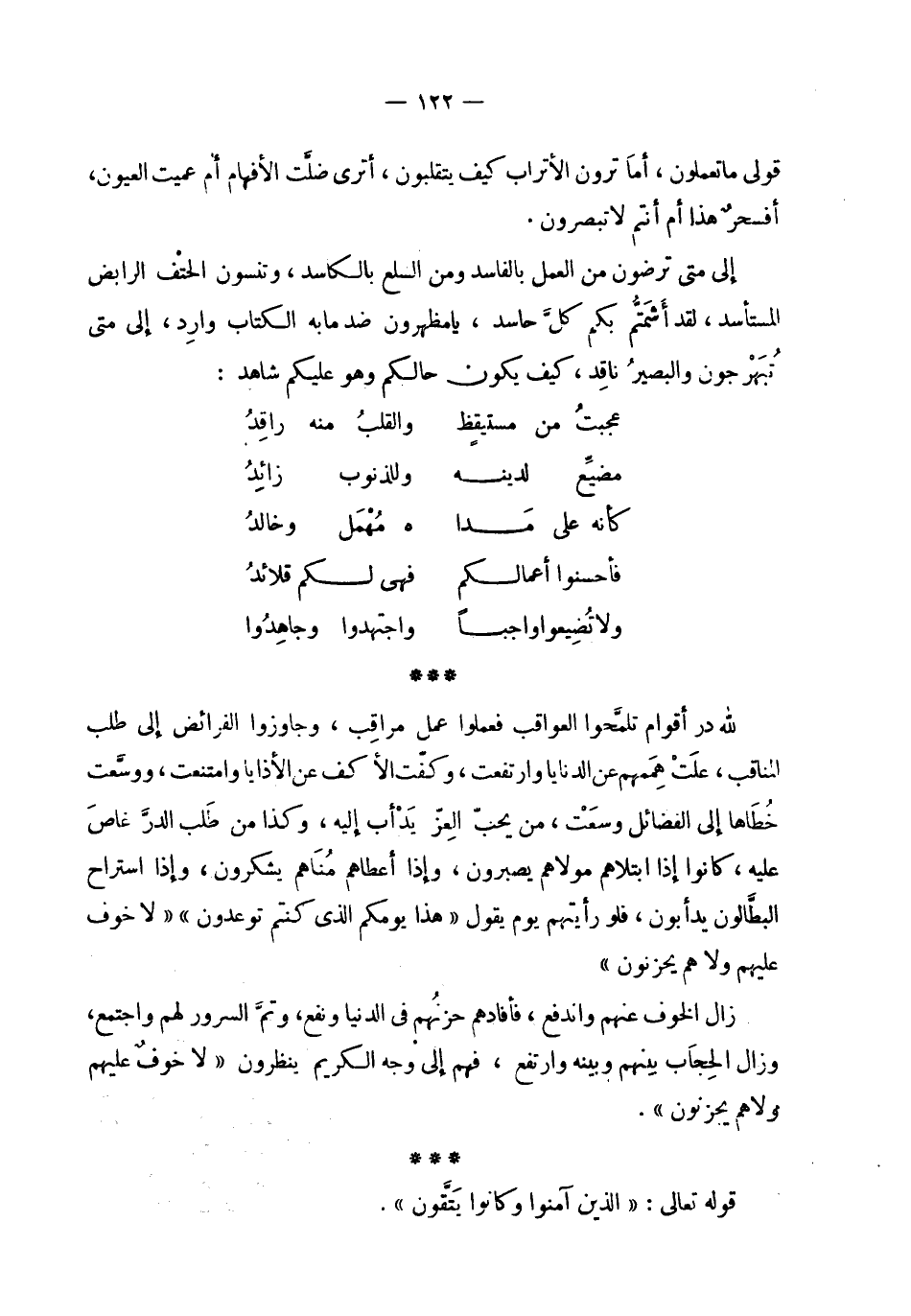 | قولي ما تعملون ، أما ترون الأتراب كيف يتقلبون ، أترى ضلت الأفهام أم عميت العيون ، | أفسحر هذا أم أنتم لا تبصرون . | | إلى متى ترضون من العمل بالفاسد ومن السلع بالكاسد ، وتنسون الحتف الرابض | المستأسد ، لقد أشمتم بكم كل حاسد ، يا مظهرون ضد ما به الكتاب وارد ، إلى متى | تبهرجون والبصير ناقد ، كيف يكون حالكم وهو عليكم شاهد : | | ( عجبت من مستيقظ % والقلب منه راقد ) % | | ( مضيع لدينه % وللذنوب زائد ) % | | ( كأنه على مداه % مهمل وخالد ) % | | ( فأحسنوا أعمالكم % فهي لكم قلائد ) % | | ( ولا تضيعوا واجباً % واجتهدوا وجاهدوا ) % | | لله در أقوام تلمحوا العواقب فعملوا عمل مراقب ، وجاوزوا الفرائض إلى طلب | المناقب ، علت هممهم عن الدنايا وارتفعت ، وكفت الأكف عن الأذايا وامتنعت ، ووسعت | خطاها إلى الفضائل وسعت ، من يحب العز يدأب إليه ، وكذا من طلب الدر غاص | عليه ، كانوا إذا ابتلاهم مولاهم يصبرون ، وإذا أعطاهم مناهم يشكرون ، وإذا استراح | البطالون يدأبون ، فلو رأيتهم يوم يقول ! 2 < هذا يومكم الذي كنتم توعدون > 2 ! ! 2 < لا خوف عليهم ولا هم يحزنون > 2 ! . | | زال الخوف عنهم واندفع ، فأفادهم حزنهم في الدنيا ونفع ، وتم السرور لهم واجتمع ، | وزال الحجاب بينهم وبينه وارتفع ، فهم إلى وجه الكريم ينظرون ! 2 < لا خوف عليهم ولا هم يحزنون > 2 ! . | | قوله تعالى : ! 2 < الذين آمنوا وكانوا يتقون > 2 ! . |