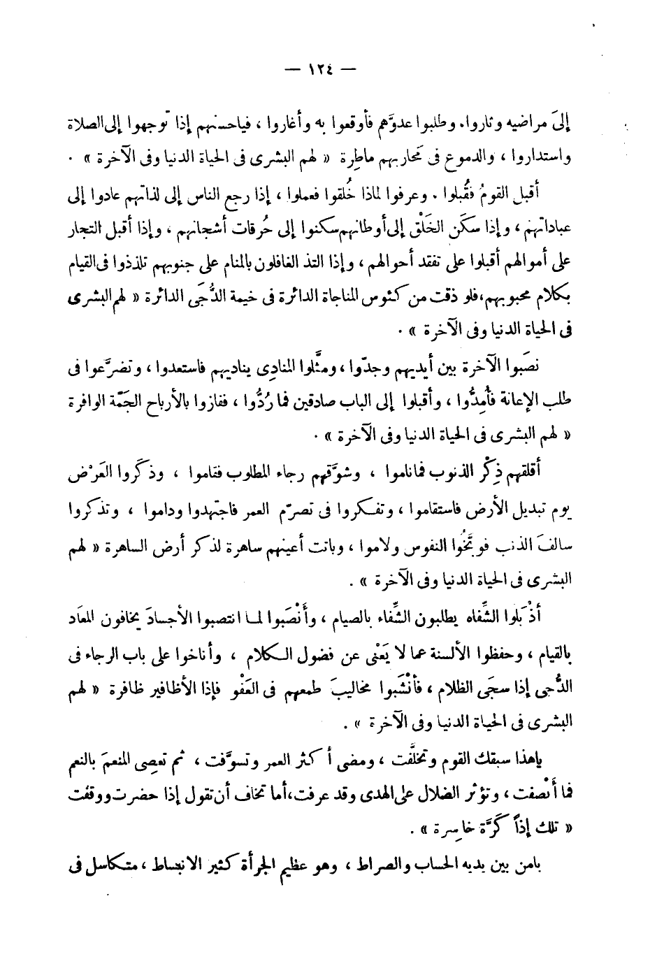 | إلى مراضيه وثاروا ، وطلبوا عدوهم فأوقعوا به وأغاروا ، فيا حسنهم إذا توجهوا إلى الصلاة | واستداروا ، والدموع في محاربهم ماطرة ! 2 < لهم البشرى في الحياة الدنيا وفي الآخرة > 2 ! . | | أقبل القوم فقبلوا ، وعرفوا لماذا خلقوا فعملوا ، إذا رجع الناس إلى لذاتهم عادوا إلى | عباداتهم ، وإذا سكن الخلق إلى أوطانهم سكنوا إلى حرقات أشجانهم ، وإذا أقبل التجار | على أموالهم أقبلوا على تفقد أحوالهم ، وإذا التذ الغافلون بالمنام على جنوبهم تلذذوا في القيام | بكلام محبوبهم ، فلو ذقت من كئوس المناجاة الدائرة في خيمة الدجى الدائرة ! 2 < لهم البشرى في الحياة الدنيا وفي الآخرة > 2 ! . | | نصبوا الآخرة بين أيديهم وجدوا ، ومثلوا المنادي يناديهم فاستعدوا ، وتضرعوا في | طلب الإعانة فأمدوا ، وأقبلوا إلى الباب صادقين فما ردوا ، ففازوا بالأرباح الجمة الوافرة | ! 2 < لهم البشرى في الحياة الدنيا وفي الآخرة > 2 ! . | | أقلقهم ذكر الذنوب فما ناموا ، وشوقهم رجاء المطلوب فقاموا ، وذكروا العرض | يوم تبديل الأرض فاستقاموا ، وتفكروا في تصرم العمر فاجتهدوا وداموا ، وتذكروا | سالف الذنب فوبخوا النفوس ولاموا ، وباتت أعينهم ساهرة لذكر أرض الساهرة ! 2 < لهم البشرى في الحياة الدنيا وفي الآخرة > 2 ! . | | أذبلوا الشفاه يطلبون الشفاء بالصيام ، وأنصبوا لما انتصبوا الأجساد يخافون المعاد | بالقيام ، وحفظوا الألسنة عما لا يعني عن فضول الكلام ، وأناخوا على باب الرجاء في | الدجى إذا سجى الظلام ، فأنشبوا مخاليب طمعهم في العفو فإذا الأظافير ظافرة ! 2 < لهم البشرى في الحياة الدنيا وفي الآخرة > 2 ! . | | يا هذا سبقك القوم وتخلفت ، ومضى أكثر العمر وتسوفت ، ثم تعصي المنعم بالنعم | فما أنصفت ، وتؤثر الضلال على الهدى وقد عرفت ، أما تخاف أن تقول إذا حضرت ووقفت | ! 2 < تلك إذا كرة خاسرة > 2 ! . | | يا من بين يديه الحساب والصراط ، وهو عظيم الجرأة كثير الانبساط ، متكاسل في |