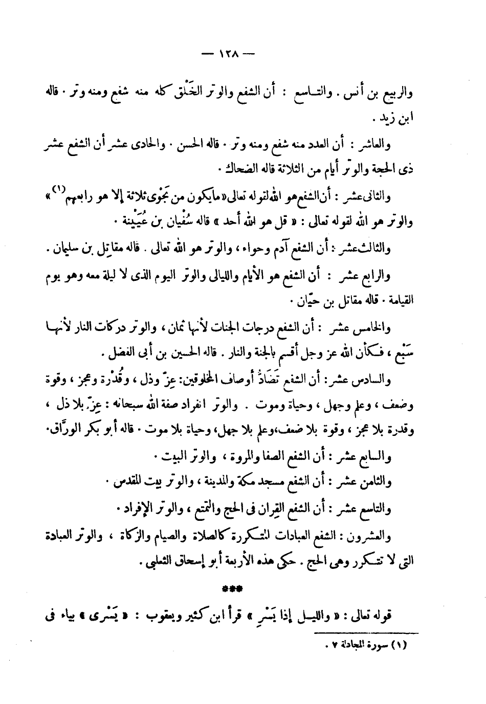 | والربيع بن أنس . والتاسع : أن الشفع والوتر الخلق كله منه شفع ومنه وتر . قاله | ابن زيد . | | والعاشر : أن العدد منه شفع ومنه وتر . قاله الحسين . والحادي عشر أن الشفع عشر | ذي الحجة والوتر أيام من الثلاثة قاله الضحاك . | | والثاني عشر : أن الشفع هو الله لقوله تعالى ! 2 < ما يكون من نجوى ثلاثة إلا هو رابعهم > 2 ! | والوتر هو الله قوله تعالى : ! 2 < قل هو الله أحد > 2 ! قاله سفيان بن عيينة . | | والثالث عشر : أن الشفع آدم وحواء ، والوتر هو الله تعالى . قاله مقاتل بن سليمان . | | والرابع عشر : أن الشفع هو الايأم والليالي والوتر اليوم الذي لا ليلة معه وهو يوم | القيامة . قاله مقاتل بن حيان . | | والخامس عشر : أن الشفع درجات الجنات لأنها ثمان ، والوتر دركات النار لأنها | سبع ، فكأن الله عز وجل أقسم بالجنة والنار . قاله الحسين بن أبي الفضل . | | والسادس عشر : أن الشفع تضاد أوصاف المخلوقين : عز وذل ، وقدرة وعجز ، وقوة | وضعف ، وعلم وجهل ، وحياة وموت . والوتر انفراد صفة الله سبحانه : عز بلا ذل ، | وقدرة بلا عجز ، وقوة بلا ضعف ، وعلم بلا جهل ، وحياة بلا موت . قاله أبو بكر الوراق . | | والسابع عشر : أن الشفع الصفا والمروة ، والوتر البيت . | | والثامن عشر : أن الشفع مسجد مكة والمدينة ، والوتر بيت المقدس . | | والتاسع عشر : أن الشفع القران في الحج والتمتع ، والوتر الإفراد . | | والعشرون : الشفع العبادات المتكررة كالصلاة والصيام والزكاة ، والوتر العبادة | التي لا تتكرر وهي الحج . حكى هذه الأربعة أبو إسحاق الثعلبي . | | قوله تعالى : ! 2 < والليل إذا يسر > 2 ! قرأ ابن كثير ويعقوب : ! 2 < يسرى > 2 ! بياء في |