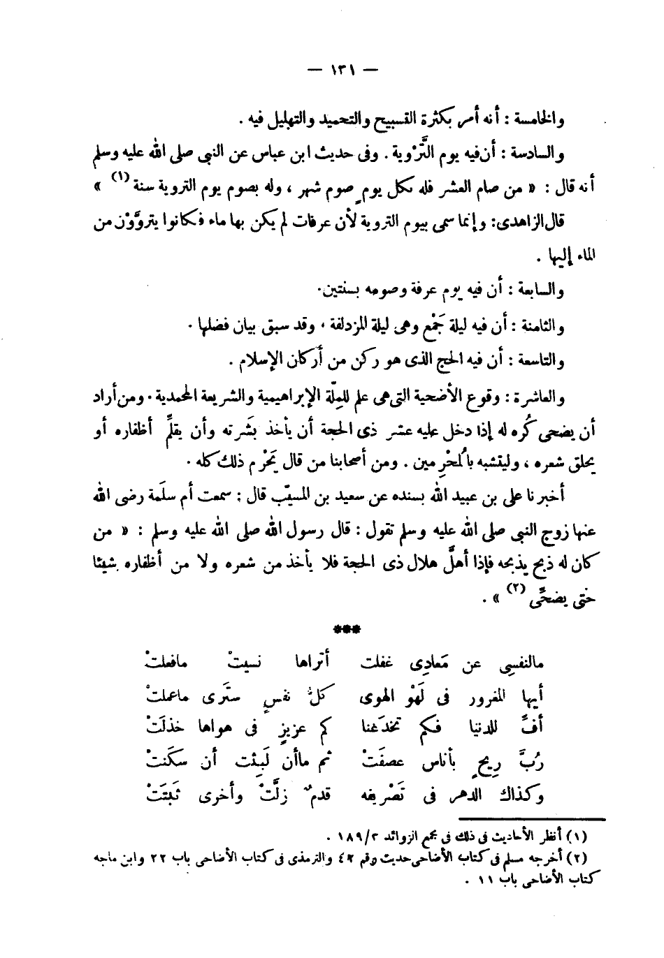 | | والخامسة : أنه أمر بكثرة التسبيح والتحميد والتهليل فيه . | | والسادسة : أن فيه يوم التروية . و في حديث ابن عباس عن النبي صلى الله عليه وسلم | أنه قال : ' من صام العشر فله بكل يوم صوم شهر , وله بصوم يوم التروية سنة ' . | | قال الزاهدي : وإنما سمي بيوم التروية لأن عرفات لم يكن بها ماء فكانوا يتروون من | الماء إليها . | | والسابعة : أن فيه يوم عرفه وصومه بسنتين . | | والثامنة : أن فيه ليلة جمع وهي ليلة المزدلفة ، وقد سبق بيان فضلها . | | والتاسعة : أن فيه الحج الذي هو ركن من أركان الإسلام . | | والعاشرة : وقوع الأضحية التي هي علم للملة الإبراهيمية والشريعة المحمدية . ومن أراد | أن يضحي كره له إذا دخل عليه عشر ذي الحجة أن يأخذ بشرته وأن يقلم أظفاره أو | يحلق شعره ، وليتشبه بالمحرمين . ومن أصحابنا من قال يحرم ذلك كله . | | أخبرنا علي بن عبيد الله بسنده عن سعيد بن المسيب قال : سمعت أم سلمة رضي الله | عنها زوج النبي صلى الله عليه وسلم تقول : قال رسول الله صلى الله عليه وسلم : ' من | كان له ذبح يذبحه فإذا أهل هلال ذي الحجة فلا يأخذ من شعره ولا من أظفاره شيئاً | حتى يضحي ' . | | ( ما لنفسي عن معادي غفلت % أتراها نسيت ما فعلت ) % | | ( أيها المغرور في لهو الهوى % كل نفس سترى ما عملت ) % | | ( أف للدنيا فكم تخدعنا % كم عزيز في هواها خذلت ) % | | ( رب ريح بأناس عصفت % ثم ما أن لبثت أن سكنت ) % | | ( وكذاك الدهر في تصريفه % قدم زلت وأخرى ثبتت ) % |