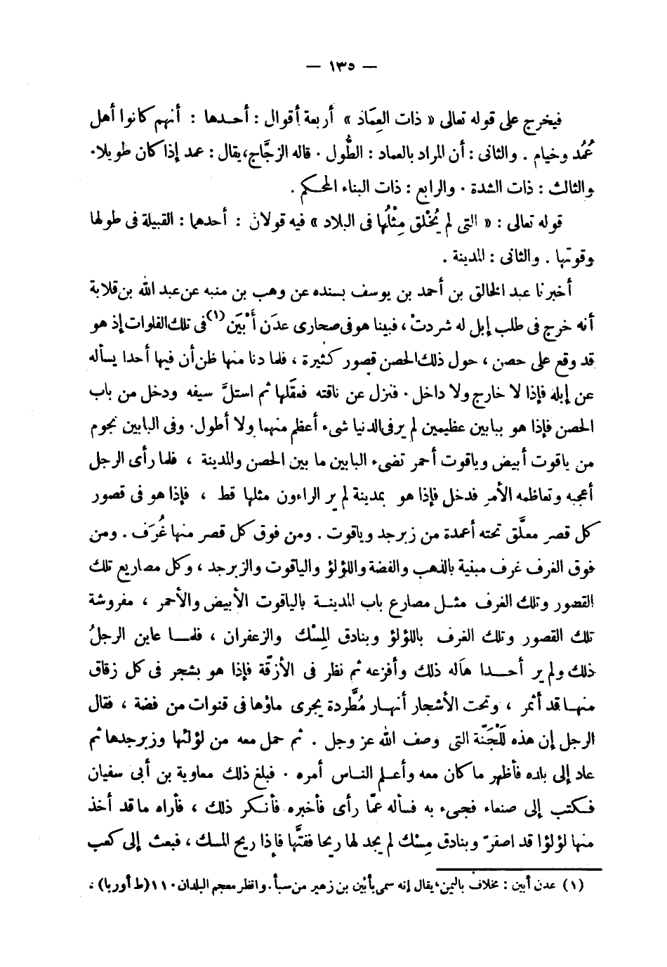| | فيخرج على قوله تعالى ' ذات العماد ' أربعة أقوال : أحدها : أنهم كانوا أهل | عمد وخيام . والثاني : أن المراد بالعماد : الطول . قاله الزجاج ، يقال : عمد إذا كان طويلا . | والثالث : ذات الشدة . والرابع : ذات البناء المحكم . | | قوله تعالى : ! 2 < التي لم يخلق مثلها في البلاد > 2 ! فيه قولان : أحدهما : القبيلة في طولها | وقوتها . والثاني : المدينة . | | أخبرنا عبد الخالق بن أحمد بن يوسف بسنده عن وهب بن منبه عن عبد الله بن قلابة | أنه خرج في طلب إبل له شردت ، فبينا هو في صحارى عدن أبين في تلك الفلوات إذ هو | قد وقع على حصن ، حول ذلك الحصن قصور كثيرة ، فلما دنا منها ظن أن فيها أحدا يسأله | عن إبله فإذا لا خارج ولا داخل . فنزل عن ناقته فعقلها ثم استل سيفه ودخل من باب | الحصن فإذا هو ببابين عظيمين لم ير في الدنيا شيء أعظم منهما ولا أطول ، وفي البابين نجوم | من ياقوت أبيض وياقوت أحمر تضيء البابين ما بين الحصن والمدينة ، فلما رأى الرجل | أعجبه وتعاظمه الأمر فدخل فإذا هو بمدينة لم ير الراءون مثلها قط ، فإذا هو في قصور | كل قصر معلق تحته أعمدة من زبرجد وياقوت . ومن فوق كل قصر منها غرف . ومن | فوق الغرف غرف مبنية بالذهب والفضة واللؤلؤ والياقوت والزبرجد ، وكل مصاريع تلك | القصور وتلك الغرف مثل مصارع باب المدينة بالياقوت الأبيض والأحمر ، مفروشة | تلك القصور وتلك الغرف باللؤلؤ وبنادق المسك والزعفران ، فلما عاين الرجل | ذلك ولم ير أحدا هاله ذلك وأفزعه ثم نظر في الأزقة فإذا هو بشجر في كل زقاق | منها قد أثمر ، وتحت الأشجار أنهار مطردة يجري ماؤها في قنوات من فضة ، فقال | الرجل إن هذه للجنة التي وصف الله عز وجل . ثم حمل معه من لؤلئها وزبرجدها ثم | عاد إلى بلده فأظهر ما كان معه وأعلم الناس أمره . فبلغ ذلك معاوية بن أبي سفيان | فكتب إلى صنعاء فجيء به فسأله عما رأى فأخبره فأنكر ذلك ، فأراه ما قد أخذ | منها لؤلؤا قد اصفر وبنادق مسك لم يجد لها ريحا ففتها فإذا ريح المسك ، فبعث إلى كعب |