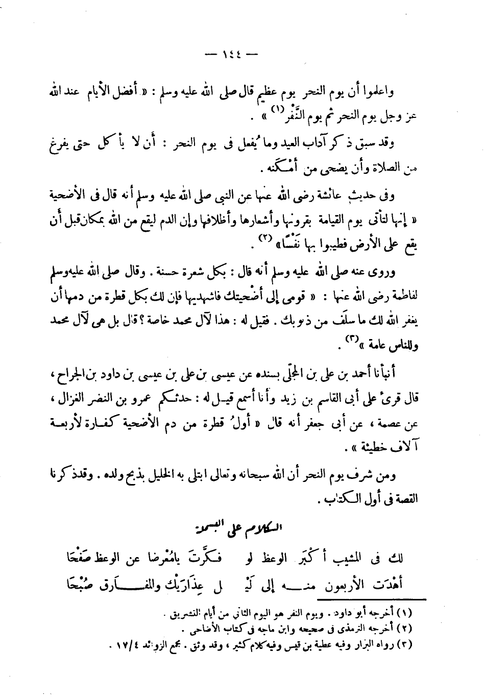 | | واعلموا أن يوم النحر يوم عظيم قال صلى الله عليه وسلم : ' أفضل الأيام عند الله | عز وجل يوم النحر ثم يوم النفر ' . | | وقد سبق ذكر آداب العيد وما يفعل في يوم النحر : أن لا يأكل حتى يفرغ | من الصلاة وأن يضحي من أمكنه . | | وفي حديث عائشة رضي الله عنها عن النبي صلى الله عليه وسلم أنه قال في الأضحية | ' إنها لتأتي يوم القيامة بقرونها وأشعارها وأظلافها وإن الدم ليقع من الله بمكان قبل أن | يقع على الأرض فطيبوا بها نفسا ' . | | وروي عنه صلى الله عليه وسلم أنه قال : بكل شعرة حسنة . وقال صلى الله عليه وسلم | لفاطمة رضي الله عنها : ' قومي إلى أضحيتك فاشهديها فإن لك بكل قطرة من دمها أن | يغفر الله لك ما سلف من ذنوبك . فقيل له : هذا لآل محمد خاصة ؟ قال بل هي لآل محمد | وللناس عامة ' . | | أنبأنا أحمد بن علي بن المجلي بسنده عن عيسى بن علي بن عيسى بن داود بن الجراح ، | قال قرىء على أبي القاسم بن زيد وأنا أسمع قيل له : حدثكم عمرو بن النضر الغزال ، | عن عصمة ، عن أبي جعفر أنه قال ' أول قطرة من دم الأضحية كفارة لأربعة | آلاف خطيئة ' . | | ومن شرف يوم النحر أن الله سبحانه وتعالى ابتلى به الخليل بذبح ولده . وقد ذكرنا | القصة في أول الكتاب . | الكلام على البسملة | | ( لك في المشيب أكبر الوعظ لو % فكرت يا معرضا عن الوعظ صفحا ) % | | ( أهدت الأربعون منه إلى ليل % عذاريك والمفارق صبحا ) % |