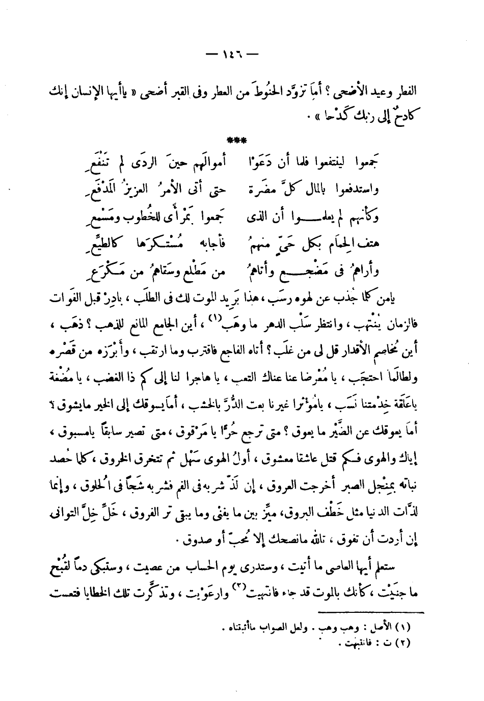 | الفطر وعيد الأضحى ؟ أما تزود الحنوط من العطر وفي القبر أضحى ! 2 < يا أيها الإنسان إنك كادح إلى ربك كدحا > 2 ! | | ( جمعوا لينتفعوا فلما أن دعوا % أموالهم حين الردى لم تنفع ) % | | ( واستدفعوا بالمال كل مضرة % حتى أتى الأمر العزيز المدفع ) % | | ( وكأنهم لم يعلموا أن الذي % جمعوا بمرأى للخطوب ومسمع ) % | | ( هتف الحمام بكل حي منهم % فأجابه مستكرها كالطيع ) % | | ( وأراهم في مضجع وأتاهم % من مطلع وسقاهم من مكرع ) % | | يا من كلما جذب عن لهوه رسب ، هذا يريد الموت لك في الطلب ، بادر قبل الفوات | فالزمان ينتهب ، وانتظر سلب الدهر ما وهب ، أين الجامع المانع للمذهب ؟ ذهب ، | أين مخاصم الأقدار قل لي من غلب ؟ أتاه الفاجع فاقترب وما ارتقب ، وأبرزه من قصره | ولطالما احتجب ، يا معرضا عنا عناك التعب ، يا هاجرا لنا إلى كم ذا الغضب ، يا مضغة | يا علقة خدمتنا نسب ، يا مؤثرا غيرنا بعت الدر بالخشب ، أما يسوقك إلى الخير ما يشوق ؟ | أما يعوقك عن الضير ما يعوق ؟ متى ترجع حرا يا مرقوق ، متى تصير سابقا يا مسبوق ، | إياك والهوى فكم قتل عاشقا معشوق ، أول الهوى سهل ثم تتخرق الخروق ، كلما حصد | نباته بمنجل الصبر أخرجت العروق ، إن لذ شربه في الفم فشربه شجا في الحلوق ، وإنما | لذات الدنيا مثل خطف البروق ، ميز بين ما يفنى وما يبقى تر الفروق ، خل خل التواني | إن أردت أن تفوق ، تالله ما نصحك إلا محب أو صدوق . | | ستعلم أيها العاصي ما أتيت ، وستدري يوم الحساب من عصيت ، وستبكي دما لقبح | ما جنيت ، كأنك بالموت قد جاء فانتهيت وارعويت ، وتذكرت تلك الخطايا فتعست |